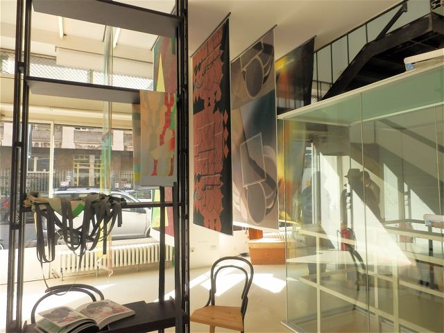 Passeggiata al sole per raggiungere lo spazio di Kaleidoscope che ospita ADELE RO?DER with Lydia Rodrigues COMCORRO?DER. Adele promuove in Via Masera un vero e proprio temporary shop con capi di abbigliamento personalizzabili attraverso la scelta di tessuti e stoffe da lei ideati, sull’ esempio di Sonia Delaunay (andate a vedere la bellissima mostra di questa artista geniale alla Fondazione Marconi, fino al  31 marzo). La Ro?der si prefigge di “superare la rigidità del tesuto, la sua natura inanimata, regolare astratta e spiegare le sue forme su un corpo femminile – anzi no – sulla superfice del mondo.” Non mi preoccupo se ci riesce. Ho ricordi di storia del costume e, questa fida è da secolo che molti stilisti si preoccupano di affrontare e non solo con gli abiti, ma anche in seno ad un concetto di abito molto elevato. Osservo, invece, le curiose ‘fantasia’ delle sete svolazzante dal soffitto al pavimento. Macchinosa l’installazione degli abiti irrigiditi.