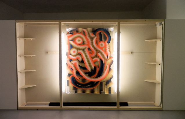 Dei neon bianchi e beige, una grande tendaggio di seta stampata. Tante tele fluttuano uno sull’altra. Motivi decoratici floreali, optical, scritte, ritornelli a cornice, follia.