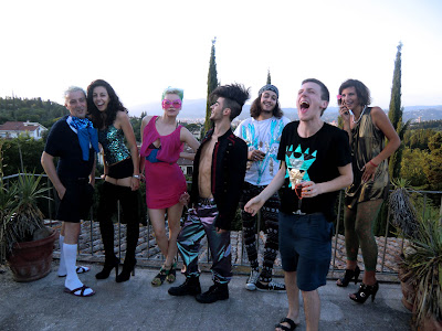 Alessandro Agudio: Beatrice Marchi di spalle vestita *lulùclub*(ipotesi di una collezione), una stola in seta, la cui cromia è ottenuta dall ingrandimento di diverse volte dell’iride dell occhio della persona che la indossa. E’ la prima ipotesi di una collezione di abiti da sera in seta. Davanti a Beatrice *Problemi*: una trave in resina marmorizzata.