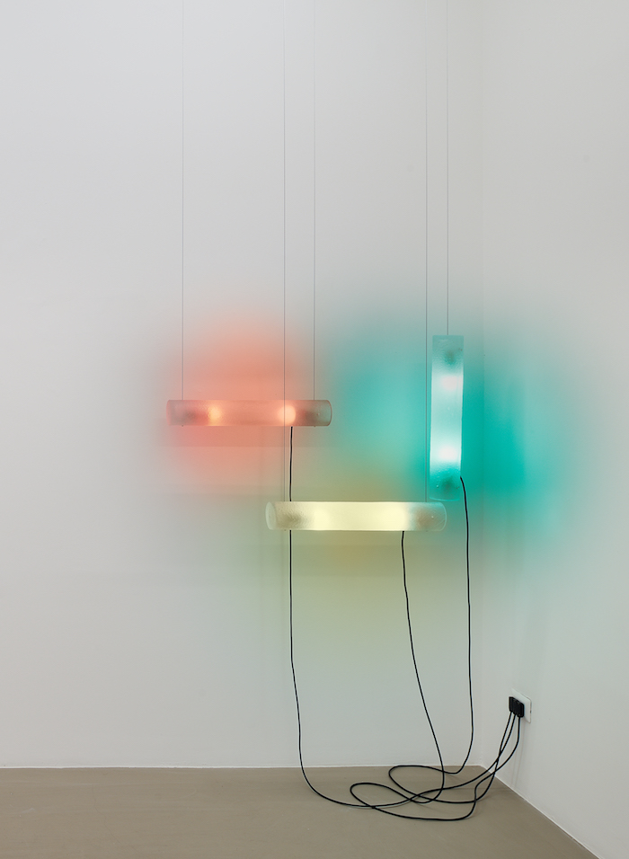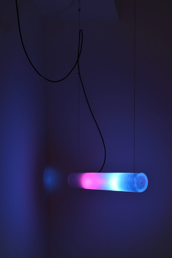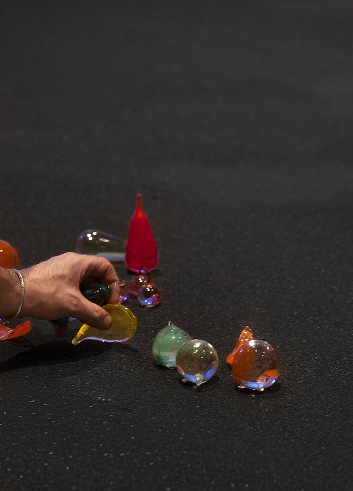 Nel caso dei led di luce luminosi Giove Pittore di farfalle (spunto dall’opera di Dosso Dossi del 1524), l’intuizione nasce da uno scambio di battute con il figlio. L’ensemble di queste lampade smart in cristallo soffiato è controllato direttamente dall’artista tramite un’app sul telefono. Piangiamore può modulare tonalità o intensità dei LED, anche in base allo stato d’animo in cui si trova in un determinato periodo della giornata. Un vero esercizio di controllo, in cui l’opera viene ad essere continuamente ridefinita dal suo stesso creatore.