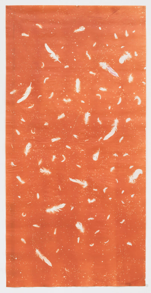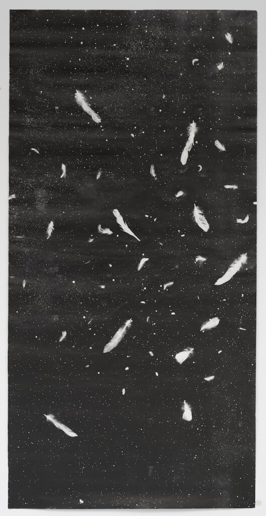 Nella serie a muro Qualche uccello si perde nel cielo (in tecnica mista su carta giapponese Mulberry) l’immagine si costruisce per sottrazione. Se si osserva il cielo o le stelle, il movimento degli uccelli sfugge. E così con l’attenzione. Non esiste una visione completa, ma solo frammenti che emergono e si dissolvono all’infinito. Qualche uccello si perde nel cielo contiene un riferimento alla caduta di Icaro, con il suo corpo che perde l’orientamento. Un cielo che esiste solo nella misura in cui qualcosa si disperde al suo interno.