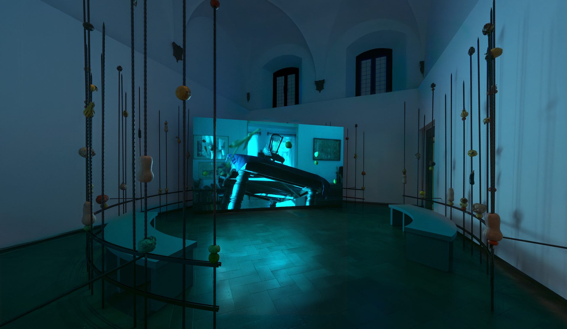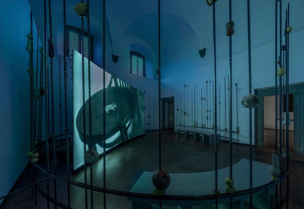 In the Project Space, the experience condenses around installations that expose matter to a non-spectacular time. Fruits pierced by metal structures surround the video Flowering and Fading (2024), entrusted to a duration that leads them to change state, to lose consistency, to slide towards another condition. The apparent violence of the gesture—the piercing—does not produce immediate destruction; it introduces a regime of waiting. What is observed is not the act itself, but its continuous aftermath.
