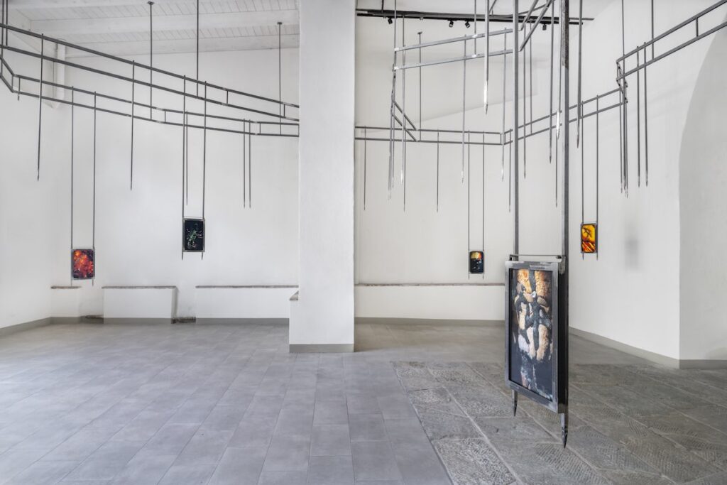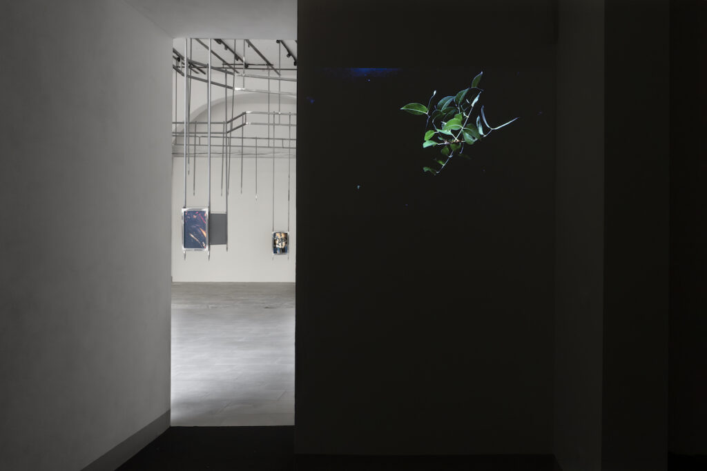 All’Oriuolo, opere come Sinking through (2025) e le serie fotografiche (Sunmap #2, Untitled, Moving on) accentuano questa sensazione di precarietà trattenuta. Le immagini sono protette, ma non stabilizzate; la metamorfosi è sospesa, non risolta. L’ambiente sembra trattenere il respiro, costringendo lo sguardo a muoversi verso l’alto, verso strutture che incombono senza offrire appoggio. Il percorso si chiude con Untitled (2025): un piccolo elemento vegetale che galleggia in uno spazio privo di coordinate riconoscibili. Non è un ritorno, né una conclusione. È una persistenza minima, che riporta lo sguardo all’inizio senza chiudere il cerchio.