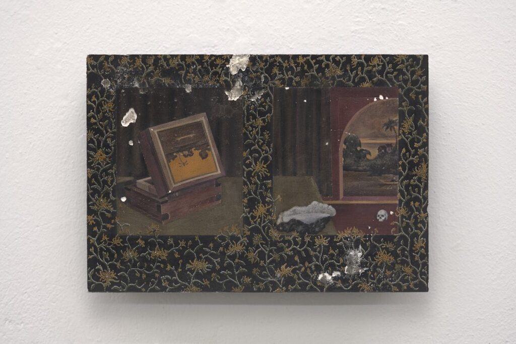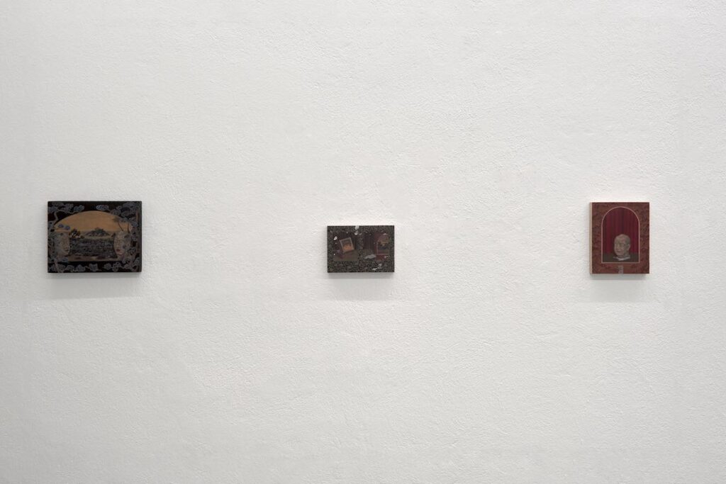 Sono passati più di tre anni da quando ho visto i lavori di Bu Shi la prima volta, nel 2022, esposti alla CAR Gallery: ero rimasta impressionata, al di là dell’abilità tecnica del giovane artista cinese, da quelle tavole di piccolo formato che racchiudevano un mondo complesso e pieno di simboli, assorbito dal nero profondo e da una luce scura, con una potente carica malinconica e crepuscolare. Ora la sua pittura, sempre frutto di un lungo lavoro di preparazione e di lenti passaggi successivi, si è come illuminata dall’interno, soprattutto nei particolari dove viene applicata come se fosse un mosaico, tessera dopo tessera. Questo richiamo alla tecnica del mosaico, che per sua natura interagisce con la luce in modo dinamico in quanto ogni tessera la riflette in modo diverso, crea un effetto vibrante e rende la pittura di Bu Shi più vivace e luminosa. Rispetto alle piccole “stanze” pittoriche di qualche anno fa, dove la luce scura incupiva l’atmosfera e la rendeva quasi metafisica, in questi nuovi lavori i piccoli interni, inscatolati nelle teche di legno, si aprono all’esterno, diventando dei paesaggi. Difficile dunque stabilire se sono wunderkammer reali o immaginate, straordinarie “camere delle meraviglie” imbevute di una nuova luce, dove convivono teste, paesaggi in miniatura, decorazioni e oggetti dal forte valore simbolico. Nuovi colori sono entrati nella tavolozza di Bu Shi: gialli zafferano e imperiale (il colore fino ai primi anni del ‘900 in Cina riservato solo alla dinastia imperiale perché dorato, limpido e luminoso), rossi carmini e ciliegia, che manifestano una più matura profondità emotiva e rendono ancora più evidente la ricca simbologia rintracciabile nelle opere, che unisce elementi della tradizione cinese, come la calligrafia e l’incisione su sigillo, a simboli ricorrenti nella tradizione dell’arte occidentale, dalla falena alla candela, dall’uovo al teschio. Basta soffermarsi sull’Isola della morte per restare incantati da questo vero e proprio racconto per immagini: se il punto di partenza è il famoso quadro di Arnold Böcklin, dove la barca rappresenta il viaggio del trapasso e del passaggio dell’anima verso l’aldilà, il lavoro di Bu Shi è un intricato racconto di oggetti simbolici, che si dipana sulla soglia tra interno ed esterno, tra natura morta e paesaggio, tra realtà vista e immaginata.
