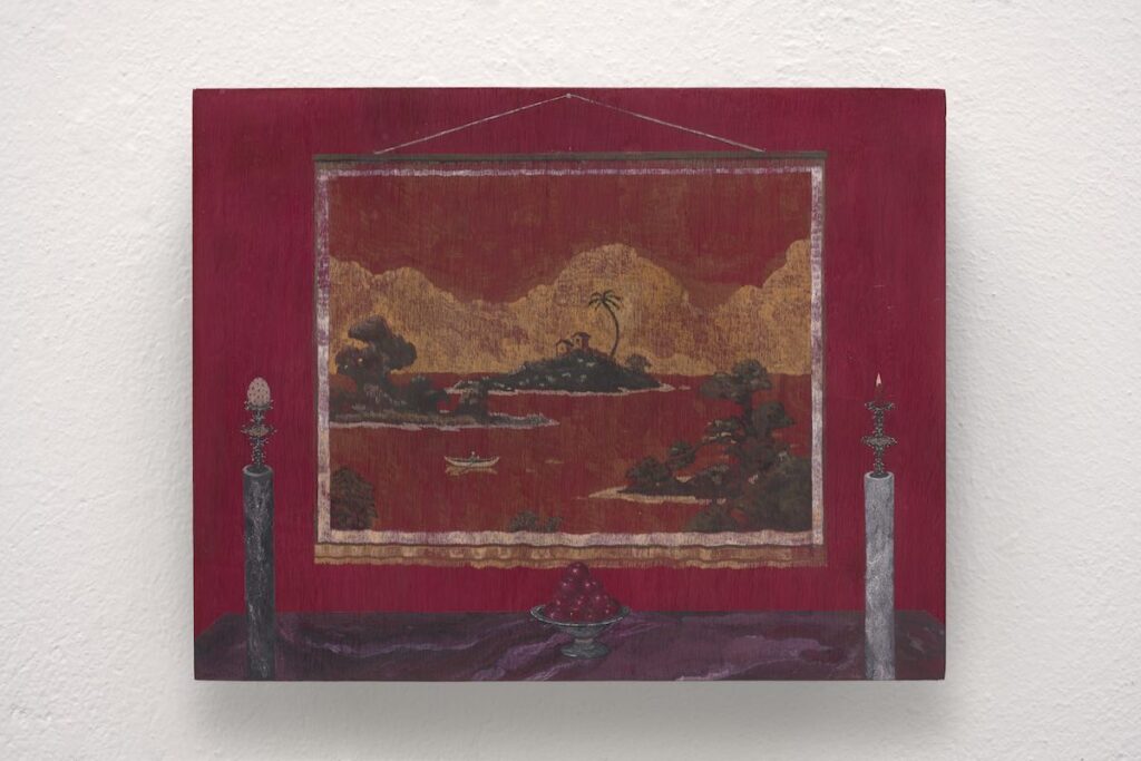 Siamo di fronte a un quadro nel quadro, espediente che serve all’artista per rovesciare il rapporto tra la realtà rappresentata e l’immaginazione e per fare emergere un’atmosfera enigmatica: la tela attaccata alla parete con un chiodo è un kakemono e raffigura un paesaggio esotico, con tanto di palma, isolette e vegetazione, dove il punctum che attira la nostra attenzione è la barchetta a remi che Bu Shi riprende da una scatolina di legno intarsiato che ritroviamo anche in altre opere, un oggetto vero facente parte della sua collezione personale. Di questa scatola l’artista scrive: “Il suo paesaggio intarsiato, immerso in un rosso totale, appare come un kakemono dalla trama tessile, nella forma degli altari con cui i cinesi rendono culto agli antenati e alle divinità”. E’ importante questo passaggio dove Bu Shi richiama il kakemono, un dipinto concepito come decorazione murale da interno e che viene appeso temporaneamente, soprattutto in occasioni particolari, e che rappresenta soggetti che hanno un valore simbolico e meditativo. Sotto il kakemono un tavolo-altare chiude frontalmente la composizione, con gli oggetti rituali di un culto privato ricco di significati: due candelabri, uno bianco e uno nero, reggono il primo una candela che brucia, un simbolo potente che evoca la trasformazione, la purificazione e la spiritualità; il secondo un uovo intarsiato che rappresenta sia il ciclo della vita che il principio cosmico universale. Nel centro una coppa piena di mele si staglia potente, rosso su rosso, con una presenza forte, quasi corporea, creando un vero e proprio corto circuito emotivo. La mela, si sa, ha molti significati simbolici, spesso conducibili alla passione, così come il colore rosso, ardente come il desiderio, è universalmente associato all’amore e alla sensualità. Incredibile quanta narrazione mistica e simbolica sia raffigurata nelle piccole tavole di Bu Shi, condensata nei piccoli oggetti dipinti fino all’ultimo dettaglio: la falena, che connette il mondo dei vivi a quello dei morti; il teschio, a sottolineare il mistero legato alla morte; la conchiglia, che rappresenta la prosperità e la femminilità, per arrivare alle teste dei monaci buddisti, rasati perché hanno rinunciato alla vanità e al mondo materiale per incamminarsi verso l’illuminazione. Il richiamo al buddismo è molto forte e presente: Bu Shi parla dei Preta, che rappresentano una condizione di sofferenza profonda, caratterizzata da fame e sete perenni mai appagate poiché ogni cibo e acqua, nel momento in cui entrano nella bocca, si trasformano in brace ardente o in metallo fuso.