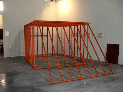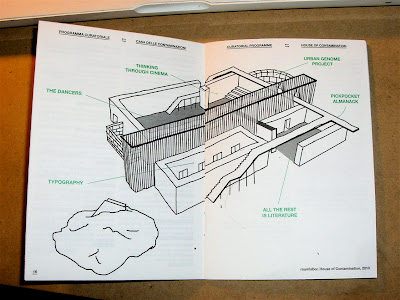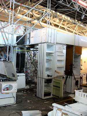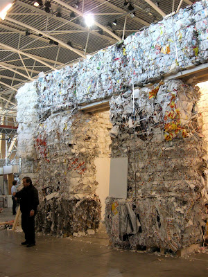 Premesso che ero inchiodata per i primi 2 giorni ad un sedia, dunque ho assistito all’arrembaggio di gente di passaggio che si avviava al bar (autogrill ready made), devo dire che sono stata fortunata: dalla mia posizione avevo un’ottima visione prospettica della House of Contamination dei Raumlabor (Berlino). Il progetto consisteva in una grande elemento architettonico costruito mediante grandi cubi di materiale recuperato (legno, plastica, stoffa ecc.) Una montagna di abiti usati (pseudo installazione di Boltanski) è stata costruita con la speranza, forse, di servire da grande divano per gli affaticati dell’arte. A parte qualche fanciullo, l’enorme seduta, ha solo arricchito il paesaggio post-consumistico attorno alla Casa delle Contaminazione. Qui si sono svolte tutte le iniziative culturali della Fiera: The Dancers (ho assistito al The Bauhaus Dances, opera di quasi cent’anni fa, del coreografo tedesco Oskar Schlemmer: serie di lezioni di danze dove si fondeva arte e scienza, trasformando il corpo dei ballerini in una sorta di marionette) Typography, Urban Genome Project, Thinking throught cinema.