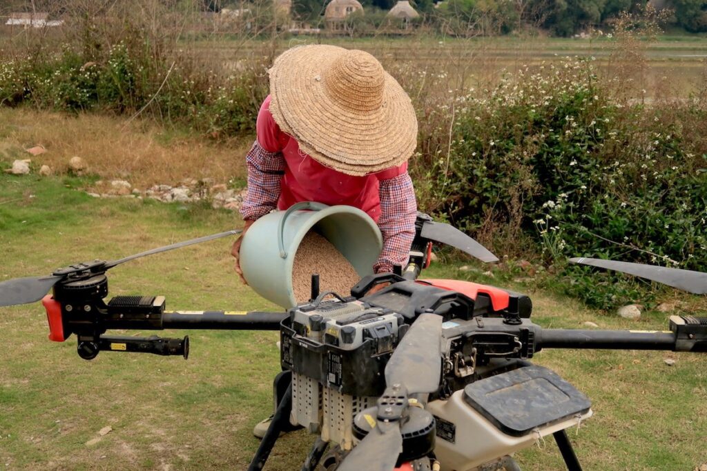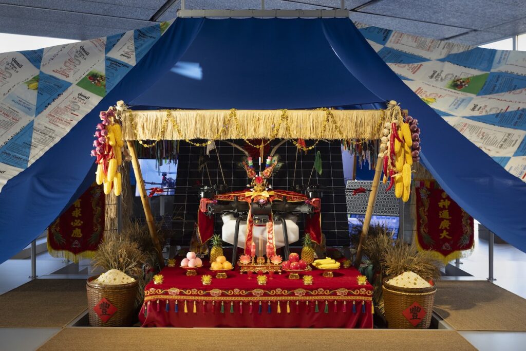Se il titolo dell’esposizione, Dash appunto, offre un chiaro riferimento alla terminologia legata al movimento assai rapido dei droni largamente impiegati nella filiera agroalimentare, occorre poi focalizzare l’attenzione sul legame affettivo e potentemente umano che i lavoratori della terra hanno sentito pian piano di voler riconoscere a questi originali marchingegni che, in qualche modo, hanno sollevato le loro spalle dalla fatica più serrata del lavoro giornaliero nei campi. Il mito, di cui la Cina si presenta assai ricca, spopola così nell’urgenza di riconoscere alle nuove presenze tecnologizzate una sacralità, che rivive di mosse e rituali strettamente legati all’universo della manualità e delle radici più profonde.