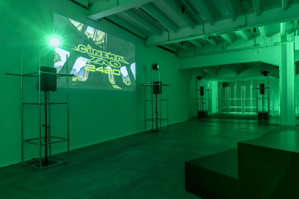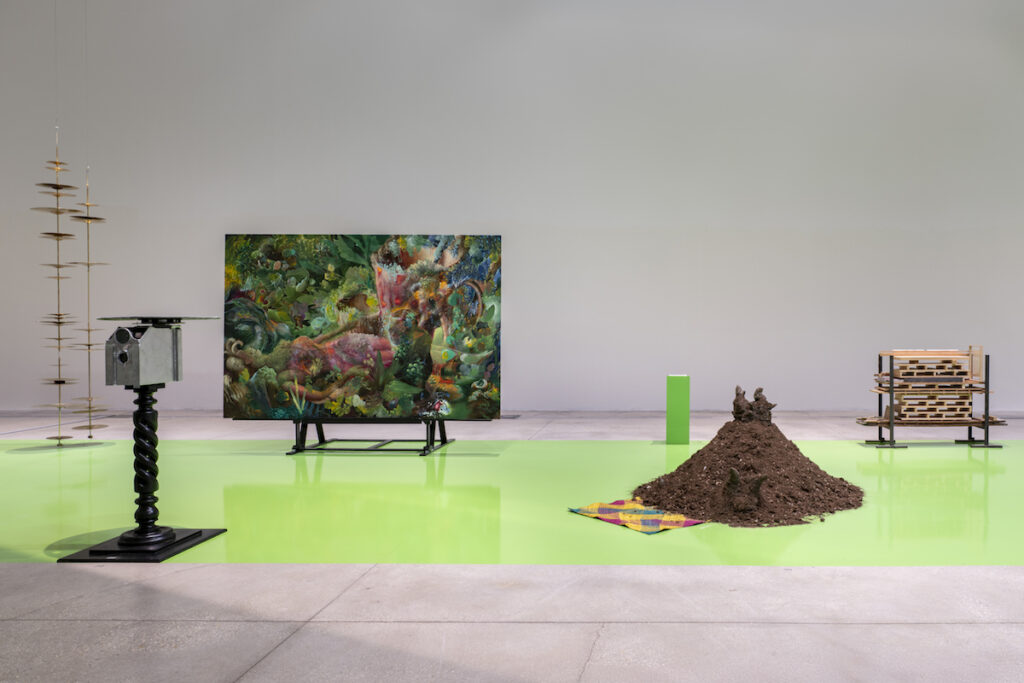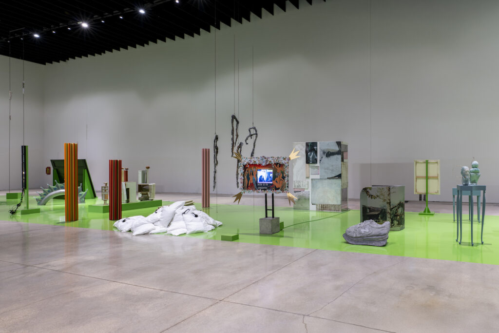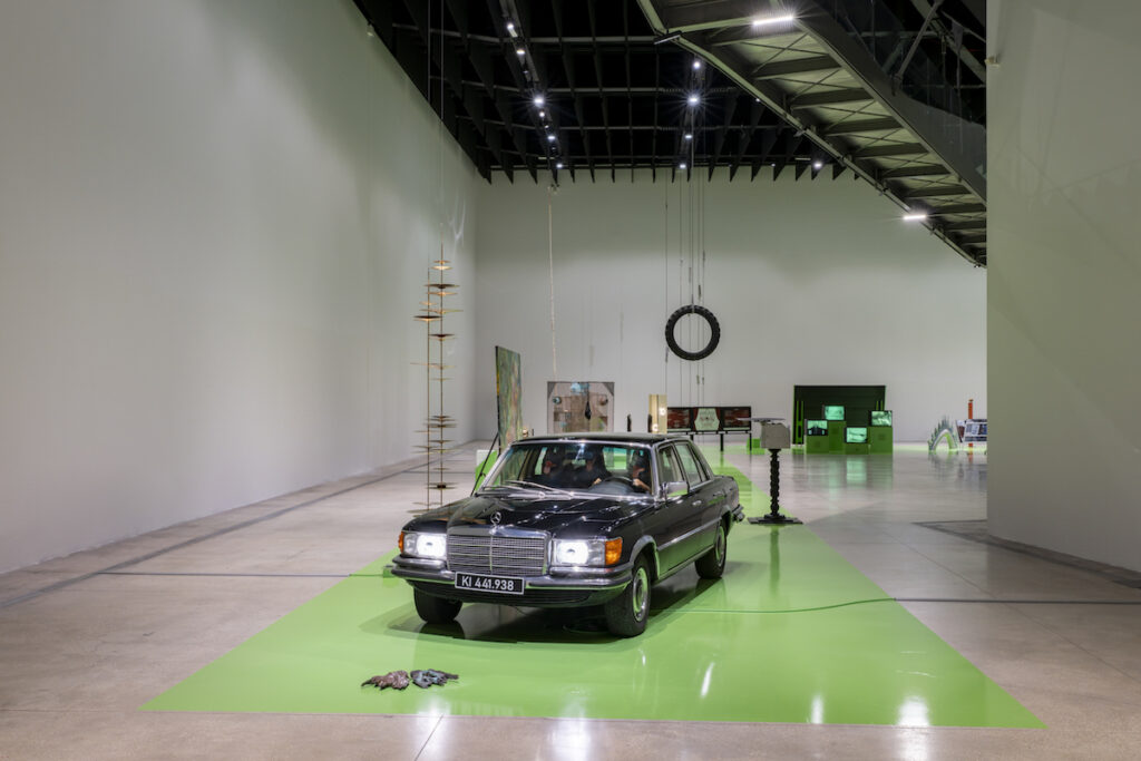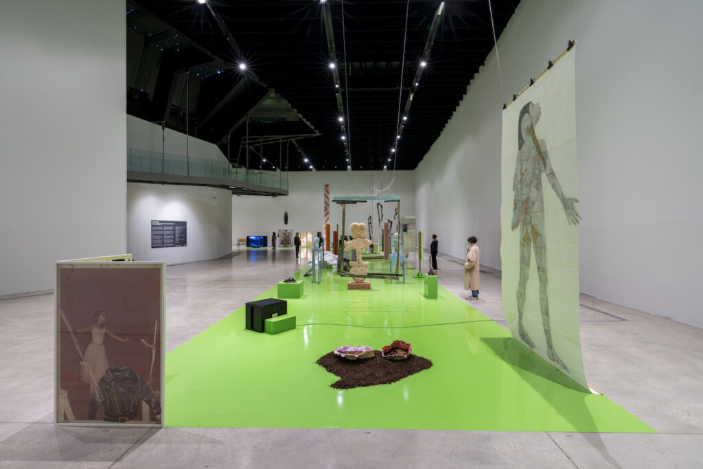Al pian terreno del museo, la collettiva UNAROMA, a cura di Cristiana Perrella e Luca Lo Pinto, presenta le opere e gli interventi di oltre settanta artiste e artisti all’interno di un set ideato dallo studio di progettazione e ricerca Parasite 2.0. Muovendosi attraverso il design, l’architettura e la scenografia, Parasite 2.0 ha immaginato una lingua verde, vero e proprio green screen, che corre lungo il pavimento della grande sala al pian terreno del museo configurandosi come un dispositivo per accogliere i diversi interventi inclusi in una collettiva che vuole essere un omaggio seppur parziale alle voci che popolano, o hanno popolato, la città di Roma; la mostra si presenta come una scena aperta in cui le opere vengono riposizionate in una rete di relazioni, frizioni, cortocircuiti temporali e formali. Interrogate per decostruire, metodologicamente, il consueto impianto cronologico che abitualmente guida i criteri espositivi, le opere finiscono per situarsi attraverso percorsi molteplici, fatti di vicinanze, contrasti, rapidi cambi di scena, tangenze formali, o accostamenti imprevisti. Rispetto allo spazio espositivo, tutto l’allestimento è osservabile da più punti di vista, così da rendere il passaggio attraverso la sala anche un ideale passaggio attraverso i tempi – diversi e stratificati – delle opere esposte.