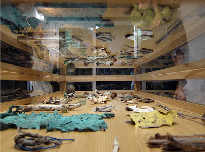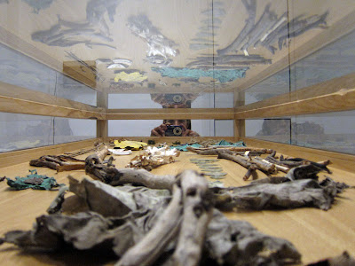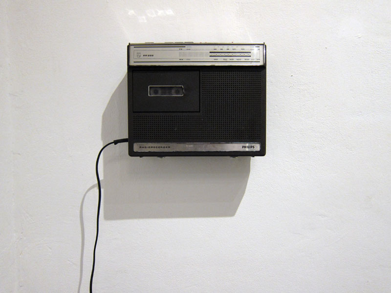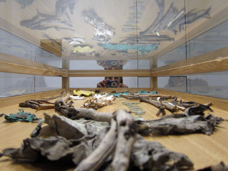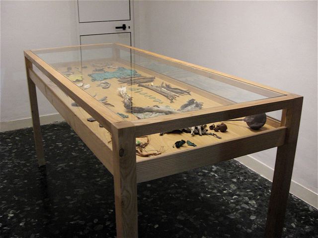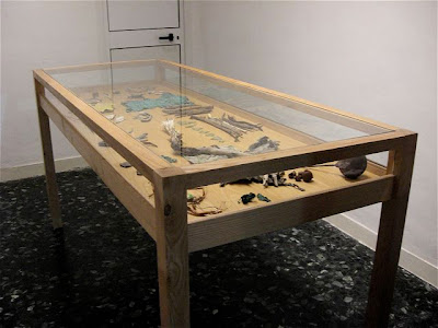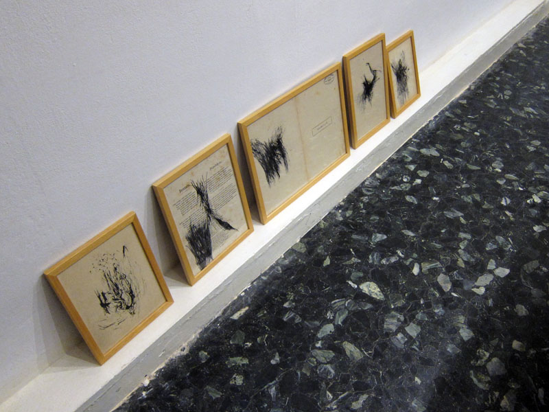Non ero mai stata da Chan, Contemporary Art Association. Con la galleria ho scoperto anche il lavoro di Christian Tripodina presente con la mostra Orchard. Nello spazio espositivo piccolissimo una grande teca che conserva frammenti di oggetti, piante, semi, piume, cocci, corde ecc. resti in cui l’artista si è imbattuto per caso, intento a ripulire un terreno vicino a Genova. Lui è un cricca di amici, stanno riportando in vita un vecchio casolare abbandonato per dar vita a Frutteto… spazio che non ho ben capito se sarà un riparo per artisti agresti, uno spazio espositivo.. un luogo per accadimenti vari. Staremo a vedere come sorgerà questa iniziativa e cosa ci proporrà. Tornando alla mostra. L’artista mi racconta che gli oggetti che ha ripulito e collocato nella teca sono una sorta di ‘discorso amoroso-emozionale’ che ha captato tra la terra e il cielo sulla collinetta in questione. L’artista, lavorando per lo più con il suono (in mostra anche una registrazione su cassetta di legni tagliati e alberi divelti) e con la performance, ha cercato di concretizzare un’opera che, a mio avviso, scricchiola un po’. Nel senso che, tutto sommato, il raccogliere frammenti, scarti, oggetti vari, non è poi una grande novità. Penso che la parte più interessante del suo lavoro, sia quella che non ho ancora visto. Oltre la teca anche una seria di disegni molto gestuali, fatti intingendo dei legnetti nel colore.