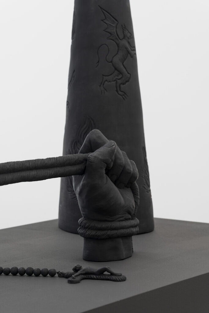 L’ultimo perimetro è dedicato alla portentosa installazione El Auto de Fe (2025). Se Ettore Sottsass sulle «ceramiche delle tenebre» ha, infatti, innalzato una delle più emozionanti riflessioni del nostro tempo, Carlos Motta fa ritorno alla ceramica smaltata di nero per restituire la presenza sofferta e controcorrente di quanti, per l’affermazione della giustizia e della libertà, nel tempo sono stati infangati, torturati e condotti alla capitolazione.