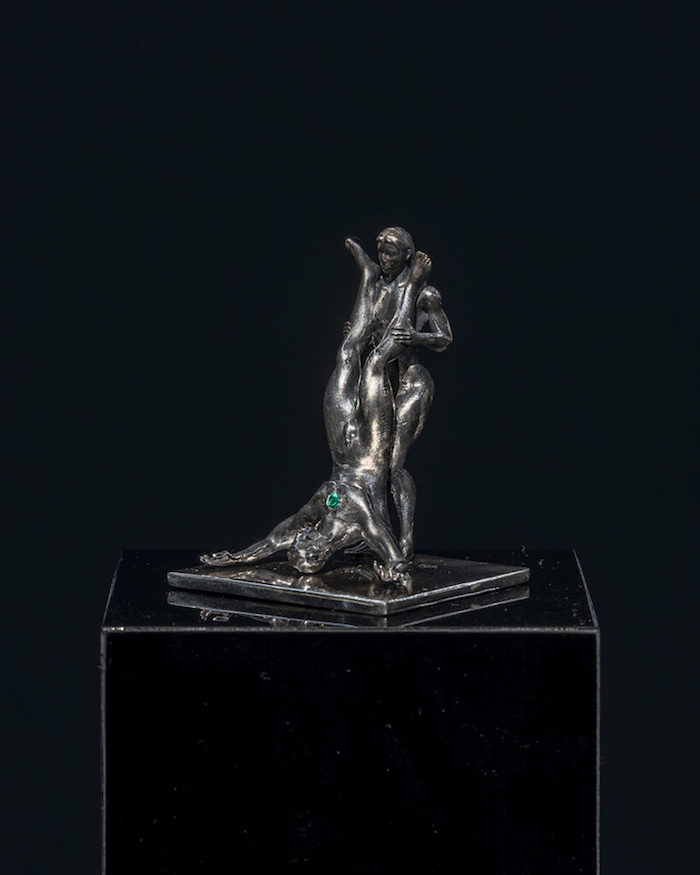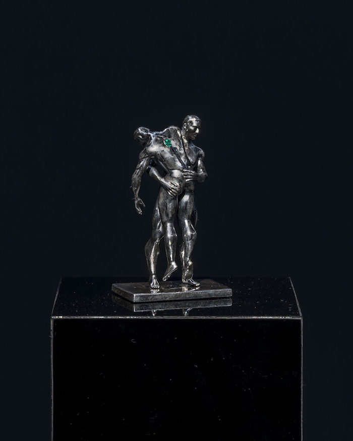 Gli occhi delle piccole figure provengono da una materia eletta della colonizzazione europea in Colombia, lo smeraldo. Un abbraccio eterno, tra disfatta e attiva solidarietà tra esseri umani, congela lo spazio limbico che apre a una nuova presenza installativa.
