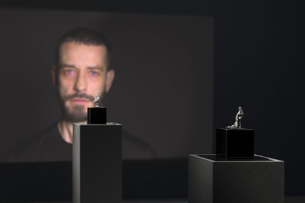 Una drammatica colonna sonora – che tra il ronzio degli insetti e delle macchine incalza sempre più verso il suono mortifero e angoscioso della guerra -, fa sì che gli occhi di Carlos Motta, immersi in uno sfondo d’oscurità, vadano a condirsi con il color del sangue e del pianto. Il sound realizzato in collaborazione con ENO restituisce la portata di un mondo sull’orlo di una sottaciuta catastrofe. No One è l’immigrato, l’invisibile, colui che viene privato dei diritti o allontanato dalla sua terra, dalla sua nuova casa. Sullo schermo scorrono parole come uguaglianza, inclusione, identità, giustizia. La loro espressione balbetta, si dissolve sino a sparire del tutto. Nel medesimo spazio condiviso, illuminate dalla luce artificiale che proviene dall’opera video, piccole statuette d’argento, poste su alti piedistalli, evocano una parvenza umana duplice. Una presenza in cui un uomo sorregge un altro uomo in dichiarato stato di abbandono o privato di ogni forza.