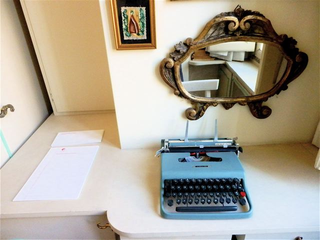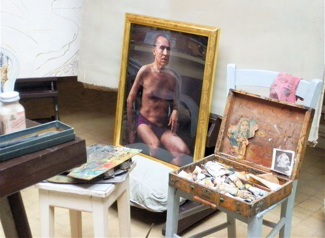 La visita finisce nello studio di De Chirico che ospita una fotografia di Ontani, una piccola scultura di Raphäel Zarka, un disegno di Carola Bonfili e un’opera di Trevisani.