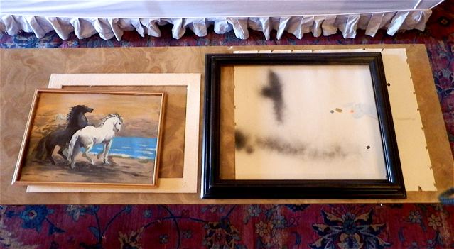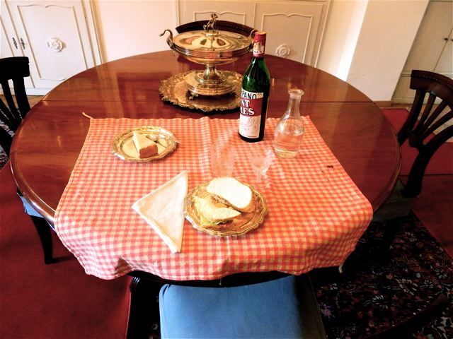 La mia visita è stata guidata dallo stesso curatore che mi ha raccontato brevemente come sono nate alcune opere, il loro punto di partenza od osservazione. Si inizia con l’opera di Luca Trevisani, Placet Experiri con Giorgio #1, al quadro ‘smontato’ con cavalli di Benny Chirco (anche lui presente all’opening, racconta che da ragazzino era rimasto impressionato da un quadro di De Chirico nel salotto dello zio), all’interessante ritratto che Giulio Frigo dedica al grande maestro, alle foglie secche incollate sulle finestre di Dan Rees (citano una fotografia di Alberto Savino che si trova al piano superiore). Continuiamo la visita con l’opera ‘divertente’ di Luca Vitone: in una piccola sala da pranzo, dove alle pareti ci sono per lo più nature morte, l’artista ligure ha inscenato una sorta di omaggio a De Chirico. L’installazione ‘Natuta morta con Punt & Mes’ consiste in una tavola preparata con tovaglia, posate, torta e panino (quelli che De Chierico era solito ordinare al baretto sotto casa) e, con il suo liquore preferito. Tutte le cose commestibili sono in realtà di plastica. In un angolo un’opera di Alek O. realizzata quando l’artista era ancora studente.