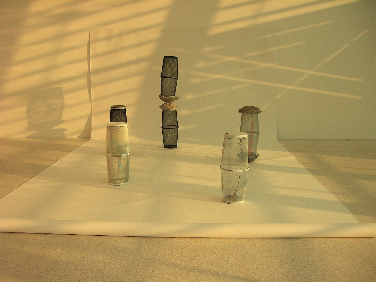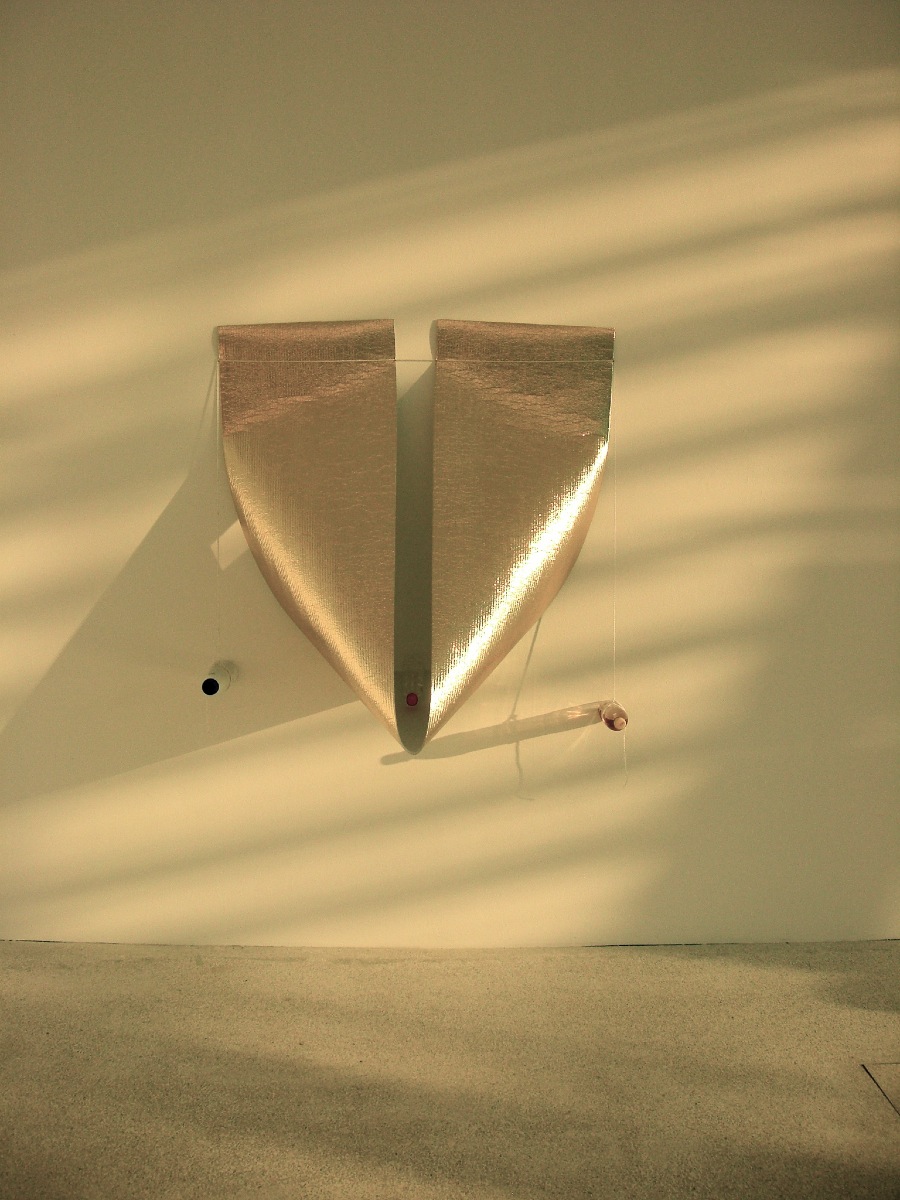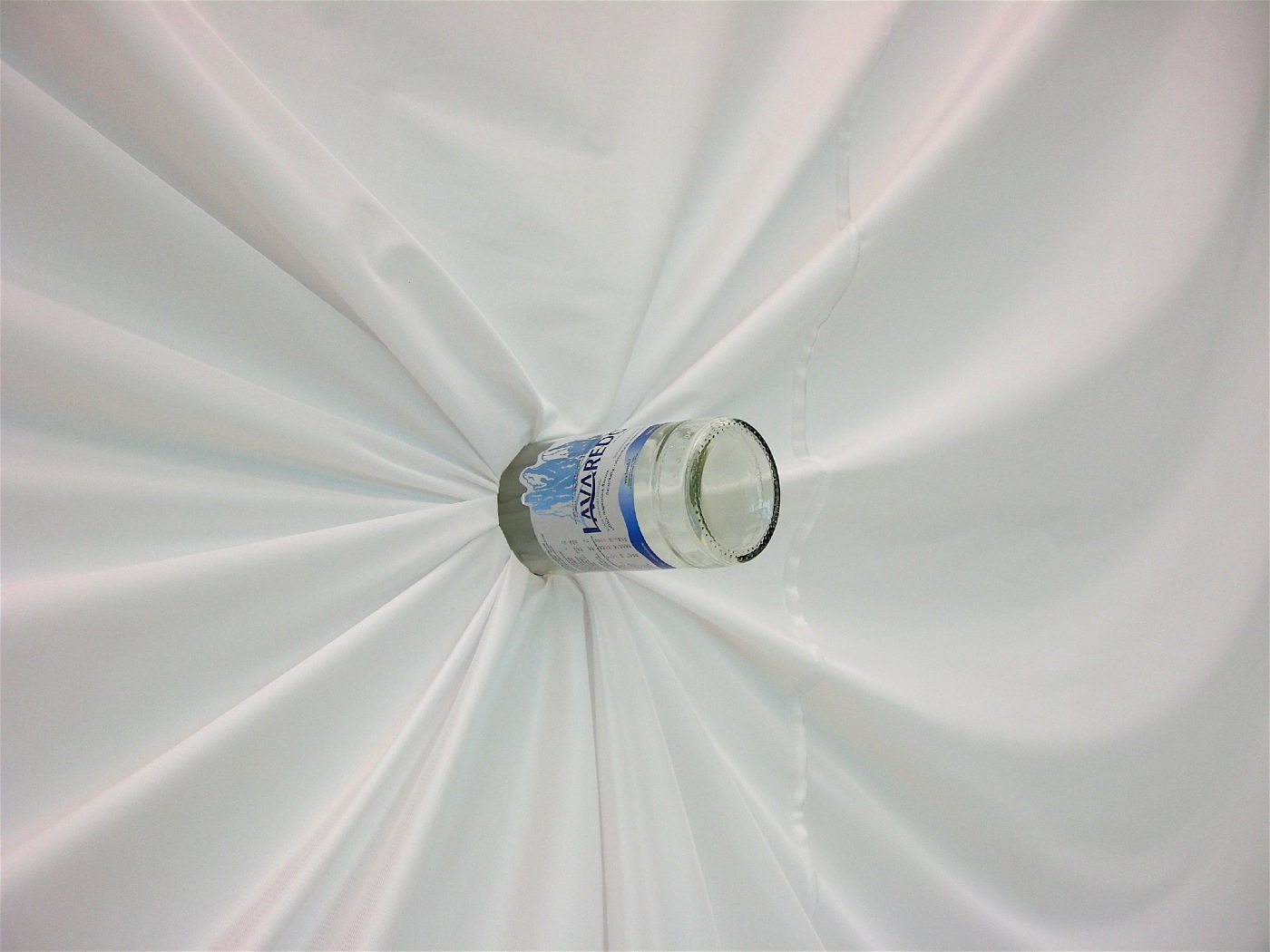 Negli altri due spazi si sviluppano le varie installazioni, 22 opere che raccontano e ribadiscono la mollezza, l’impossibilità, l’ambiguità delle cose. Penso al lavoro dei sassi che allude all’impossibilità di bloccare le nuvole, ai sacchetti di plastica che volteggiano dentro ai tre frigoriferi, alla colonna di scontrini raccolti dall’artista (sorta di diario consumistico), allestiti come fosse un gioco. Suggestivi i due banner – uno bianco e uno con l’immagine delle 3 cime di Lavaredo, Dolomiti – con ficcata in mezzo una bottiglia che rappresenta le 3 cime appunto.