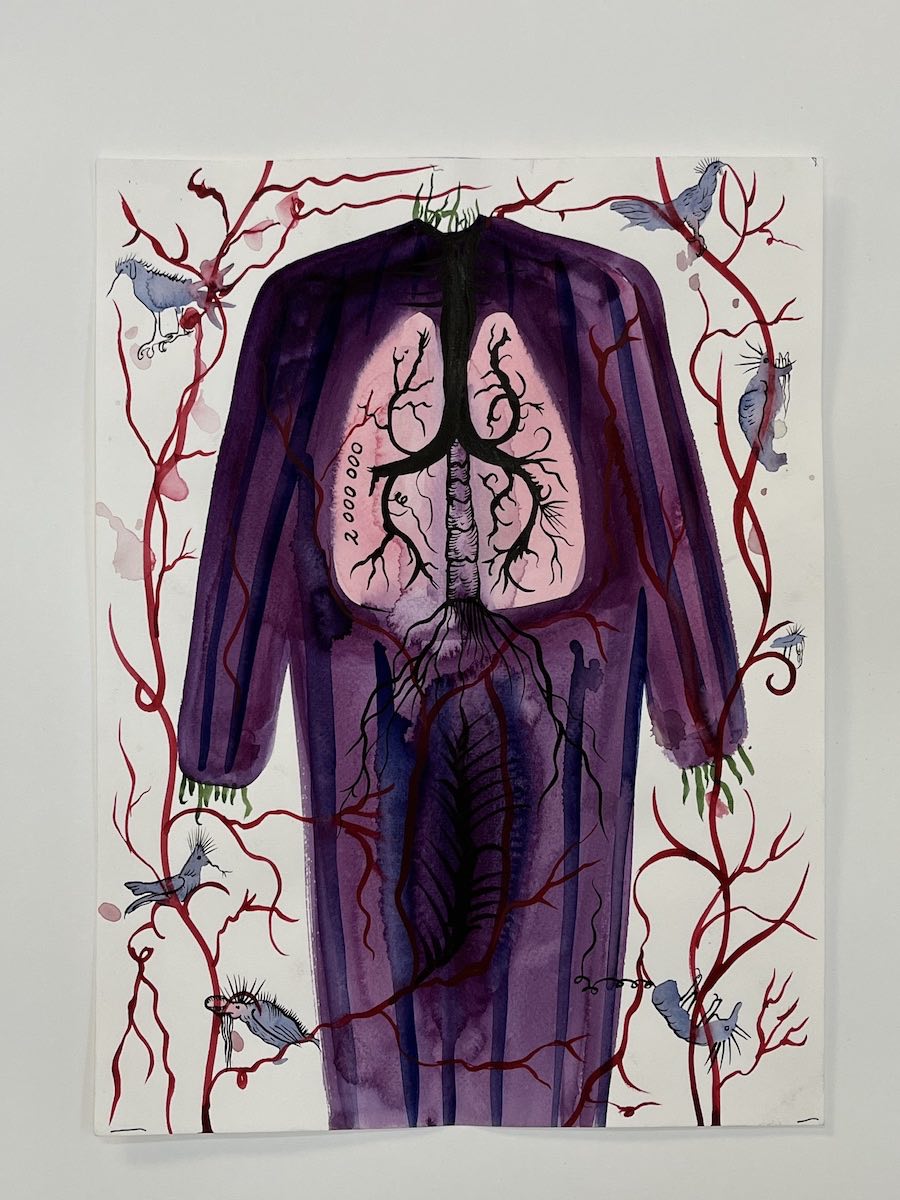 Tre di questi profili emotivi si addensano nella seconda sala in presenze fantasmatiche e fluttuanti che paiono veicolare emotività contraddittorie (Veils of Sorrow and Hope, 2022), sostanziate dal celare al loro interno oggetti donati dagli interlocutori della performance. Le installazioni impostano una vera e propria “corrispondenza visiva” con le opere di Kati Horna: con la foto della serie Hitlerei appesa accanto ad esse, in quanto sono decorate con gusci d’uovo; con Mujer y Mascara (1963), in cui una stanza in penombra è dominata da un’atmosfera di inquietudine e angoscia per la maschera mostruosa sospesa in uno spazio indefinibile (in basso una bambola pare che stia per essere fagocitata da un’altra creatura dell’incubo); ma anche con Los Reyes Magigos en la casa di Leonora (1949), in cui l’aria distesa di una recita religiosa in costume sembra auspicare un futuro di speranza. Il tema dell’abito come metafora di un vissuto è anche al centro dei Corona Drawings (2020) di Gluklya, acquerelli realizzati durante la pandemia che rappresentano dei vestiti dalle tinte violacee e nerastre, in cui i polmoni sono paradossalmente esteriorizzati, diventando ornamentazione.