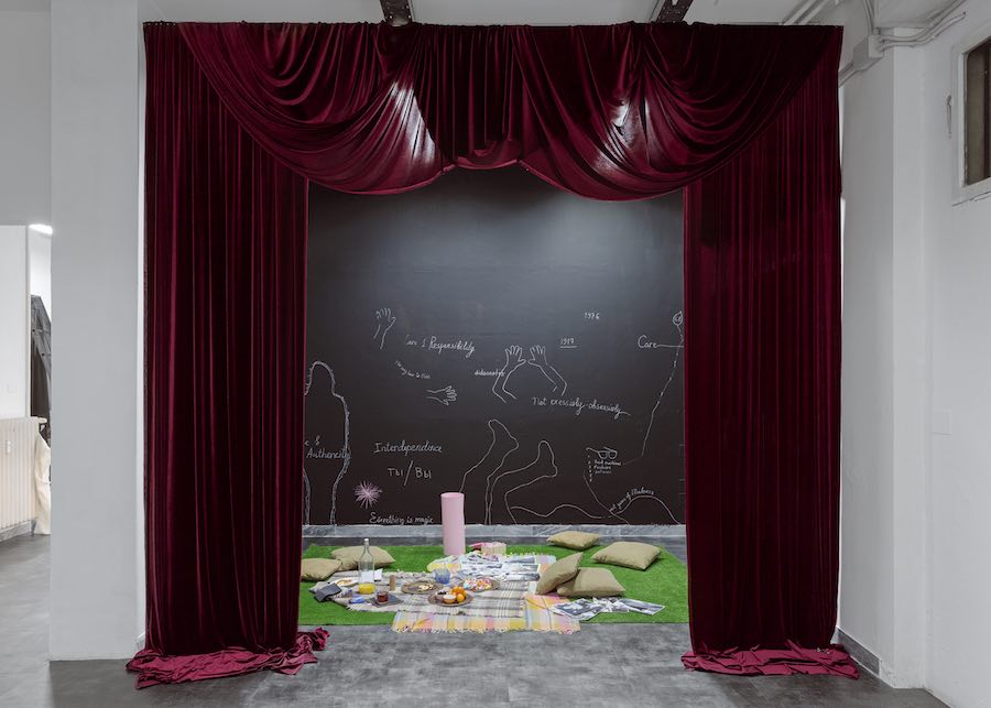 Il “giardino”, di natura fluida e prismatica come ogni oggetto o evento partorito da una mente surrealista, si configura come un vero e proprio scenario teatrale allestito nelle sale della galleria, che in una prima fase dell’esposizione aveva ospitato un evento performativo durante il quale Gluklya si era interfacciata con i visitatori intorno ai temi della resistenza e della cura rispetto ai problemi delle proprie realtà quotidiane. Una serie di scritte e disegni col gesso riportati sulle pareti di fondo del palcoscenico evidenziano i concetti più rilevanti emersi durante gli incontri e variopinti “abiti concettuali” su fogli di carta traducono metaforicamente le interiorità dei partecipanti: vi si leggono didascalie come “Dress of dinamic joy for Marinella with the balance of geometric forms and small organic details”.