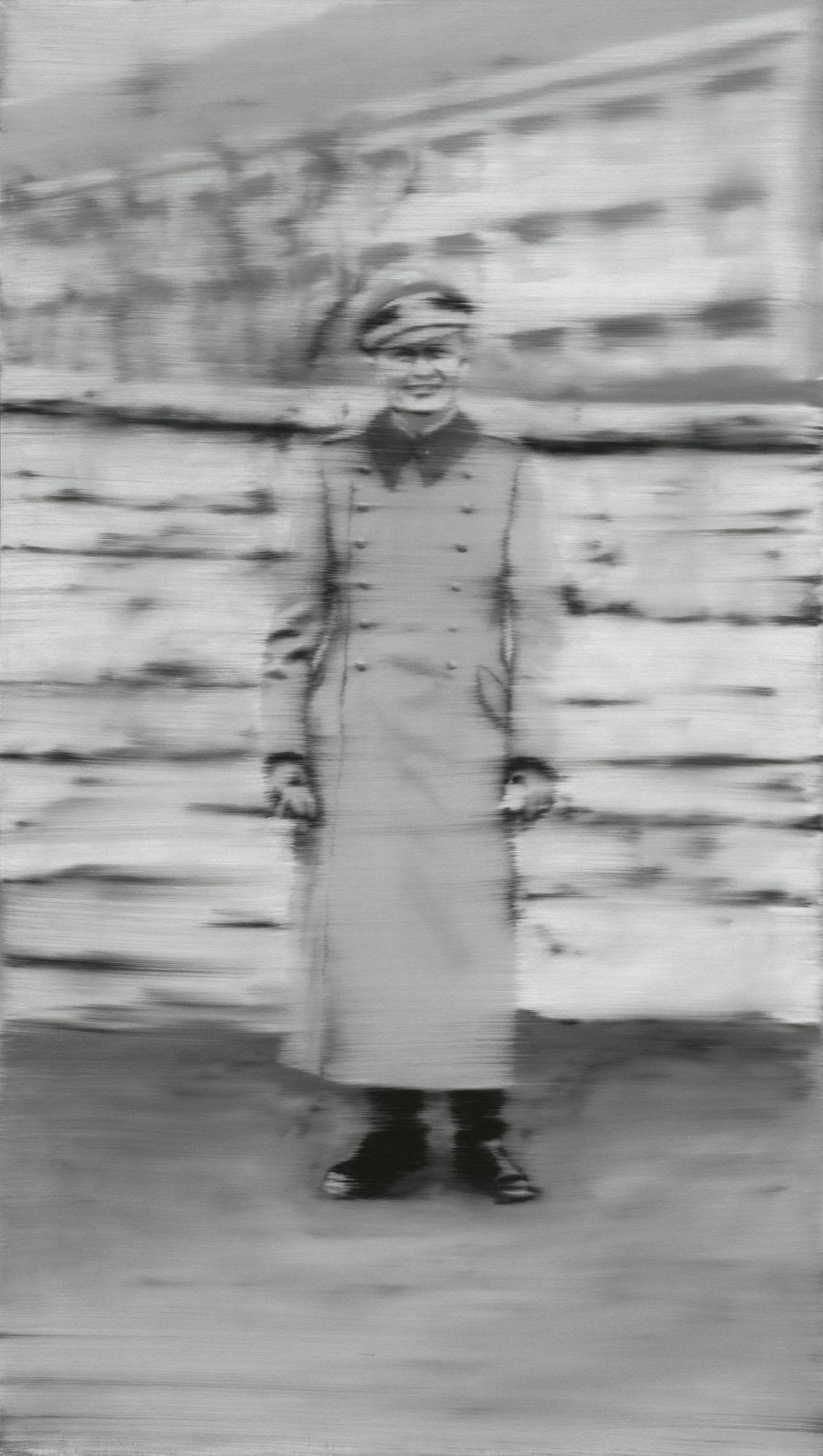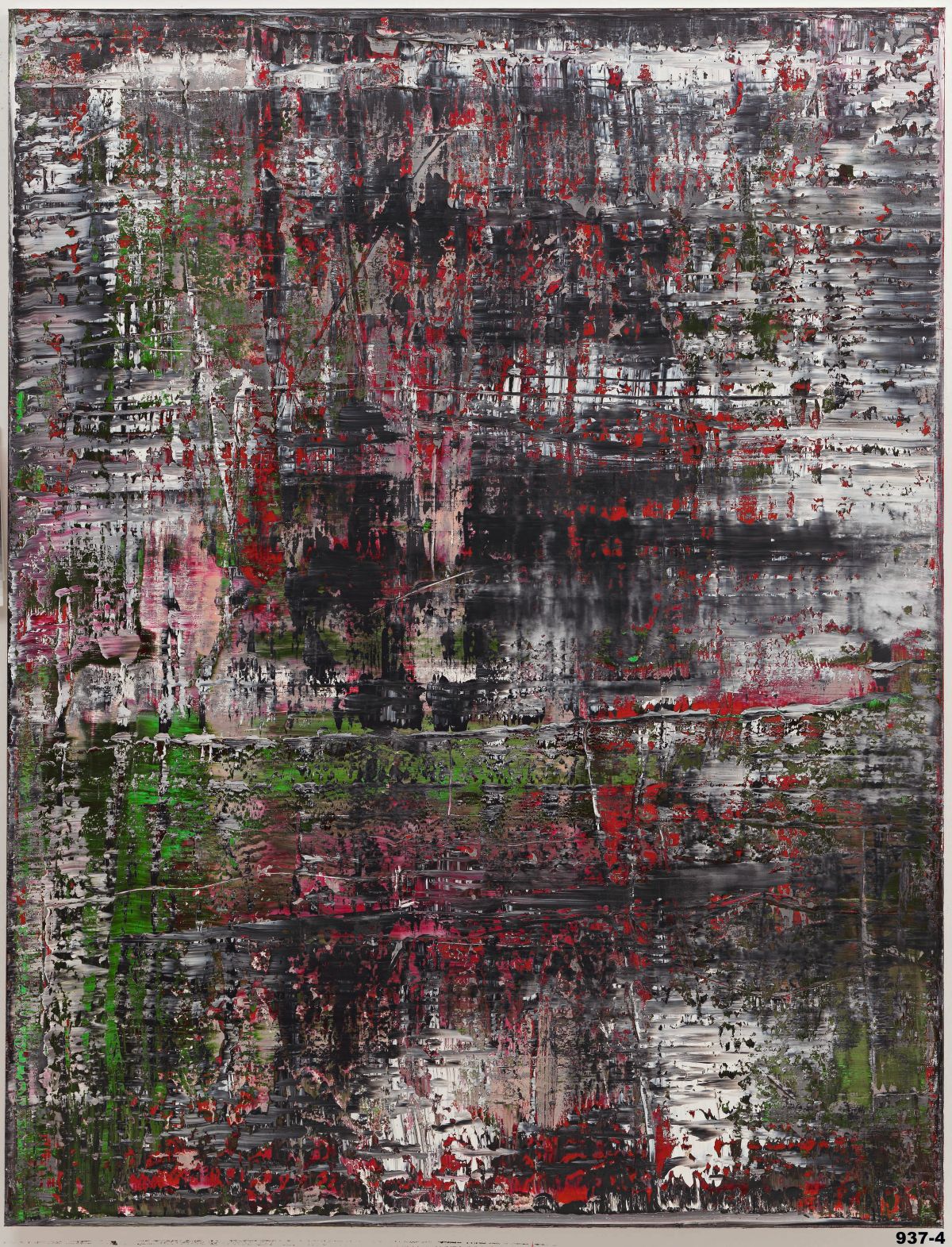 In questa sistematica compresenza di polarità si intercettano alcuni passaggi salienti. Nel corso degli anni Ottanta, Richter introduce una fase finale di raschiature condotte tramite spatole, all’insegna della casualità, che lasciano accidentata la superficie pittorica sulla tela. Questa tensione formale tra costruzione e distruzione, rivelazione e occultamento assume il suo assetto più perturbante quando lambisce la rappresentazione di immagini tragiche della Storia. Uno snodo di impatto comprende la funerea serie di 18 Oktober 1977 (1988), quindici dipinti fotografici dai grigi filtrati, dalla messa a fuoco tendente al minimo, realizzati a undici anni dal suicidio di quattro membri della cellula terroristica di estrema sinistra Baader-Meinhof Group, della Rote Armee Fraktion, che sembrano trovare una poderosa cassa armonica nella triade di dittici monumentali Januar, Dezember, November (1989), raschiati e ammantati dal sentimento cupo di un crollo imminente. Nella sala successiva, dalle cromie alleggerite, è allestito anche un dipinto in collezione Louis Vuitton, dai rossi e gialli vivaci, attraversato da spatolate, ma che significativamente rivela una meditazione a monte di 18 Oktober 1977, portando per titolo il nome di una delle fondatrici del Rote Armee Fraktion, Gudrun Ensslin (Gudrun, 1987). La frizione tra il filtraggio mimetico di una traccia fotografica e l’atto materico di seppellimento e negazione raggiunge l’apice nella serie Birkenau (2014). Senza indicazioni esterne all’opera, l’osservatore avrebbe di fronte a sé un palinsesto muto. Questo diventa eloquente solo notificando la presenza delle riproduzioni pittoriche di quattro fotografie, una per tela, scattate da membri di un Sonderkommando ai campi di sterminio di Auschwitz-Birkenau, sepolte da strati in prevalenza di bianco, nero, verde e magenta.