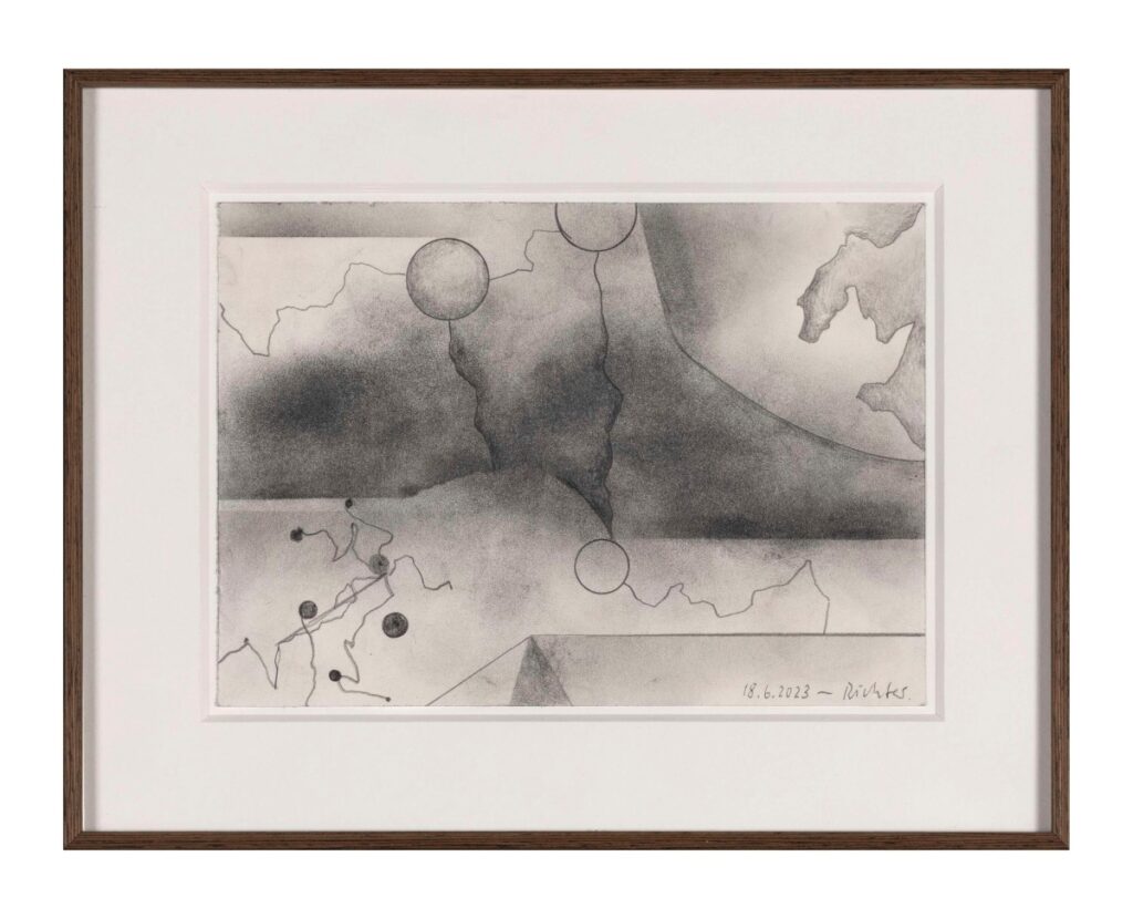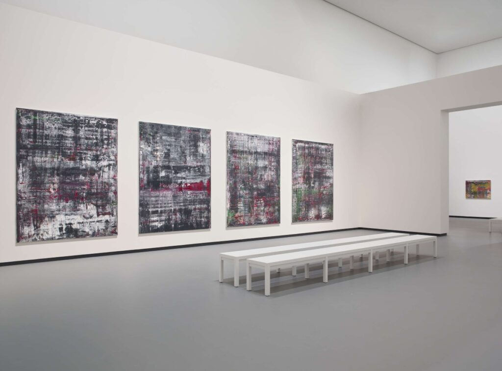 Squadernando un’ampia selezione (oltre 260 opere) dal catalogo ragionato del pittore tedesco, la mostra prende le mosse da Tisch (1962) – identificato a posteriori dall’artista quale suo inaugurale dipinto e gesto creativo, raffigurante un tavolo, a partire da una riproduzione fotografica, scientemente cancellato da un groviglio di pennellate grigie – e culmina nell’ultima serie di dipinti astratti risalente a una decina di anni fa. L’ultima sala apre agli esiti più recenti della produzione grafica di Richter, attività da lui affiancata alla pittura fin dal 1964 e mappata nel corso della mostra, con la serie Foricano (2023), composta da ventisei disegni di piccolo formato, facenti leva sulla gestualità libera della mano e sullo scivolamento aleatorio di un solvente sulla carta.