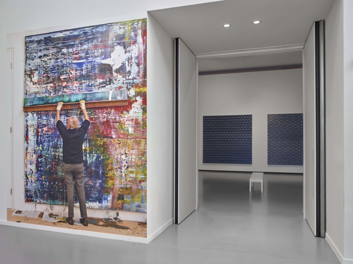 Il nucleo pulsante dell’attività di Richter è l’atelier. L’artista vi esercita il suo ‘mestiere’ di pittore attraverso una metodica routine di lavoro, tanto mentale quanto operativa, che ravvisa un’affinità profonda con la pittura accademica; legame che, biograficamente, si allaccia alla formazione alle Belle Arti della città natale Dresda negli anni Cinquanta, prima di emigrare in Germania dell’Ovest alla vigilia dell’edificazione del Muro, e si riannoda poi all’insegnamento, specialmente a Düsseldorf dal 1971 al 1986. Risulta dunque pertinente l’evocazione continua dell’iconografia del pittore nell’atelier, negli snodi di passaggio o tra le gallerie, mediante gigantografie che immortalano Richter, pacato e padrone di sé, con pennelli, lamine, diapositive in uno studio che raggruppa un insieme eterogeneo di opere.