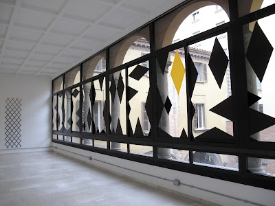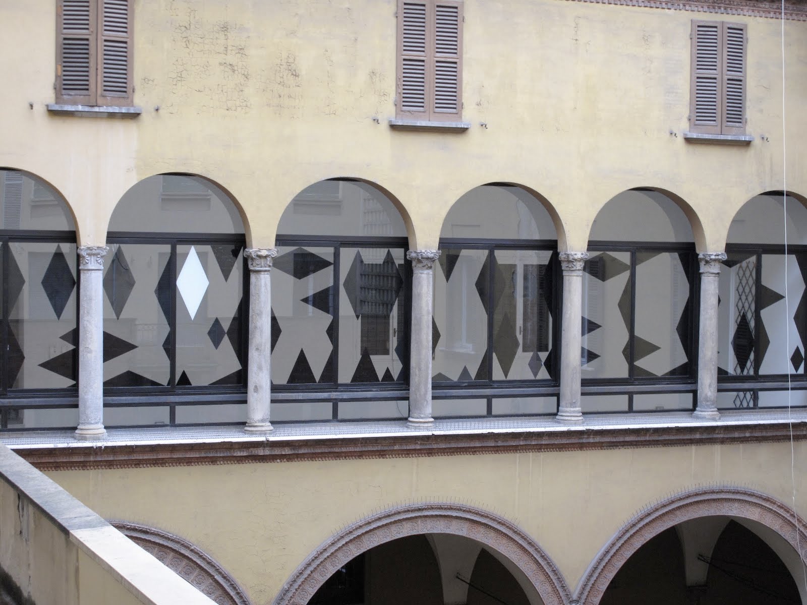I, in my intricate image è una mostra curata da Marinella Paderni a Ex-Brun Farnespazio a Bologna. E’ per pura fortuna che sono riuscita a vedere solo una parte della mostra. Durante ArteFiera gli spazi erano aperti/chiusi/semiaperti ecc. Non ho visto l’installazione di E va Marisaldi (solo foto), ma ho potuto vedere invece la grande installazione di Paolo Gonzato e sentire l’intervento, molto poetico e visionario, di Donatella Spaziani che ha registrato una voce che legge una poesia di Valentino Zeichen. Ricordo ‘un fondale sporcato dalle nuvole…’. Lo spazio non è dei più facili, visto che è un lungo corridoio caratterizzato da una parete finestrata. Ed è in questa parte dello spazio che Gonzato ha compiuto una vera e propria trasformazione cromatica. Ha applicato dei grandi fogli adesivi neri lungo tutta la vetrata, creando una sorta di elemento decorativo e/o disturbante. Il lavoro funziona e crea una sorta di annullamento della parete (per altro gli infissi sono pesantissimi e nerissimi): non si riesce a vedere bene il cortile sottostante, la visione è disturbata o modificata. Rombi, quadrati, strani poligono formano uno disegno che, applicato allo sfondo oltre i vetri, crea uno strano collage fatto di geometrie e immagini parziali dell’edificio di fronte.