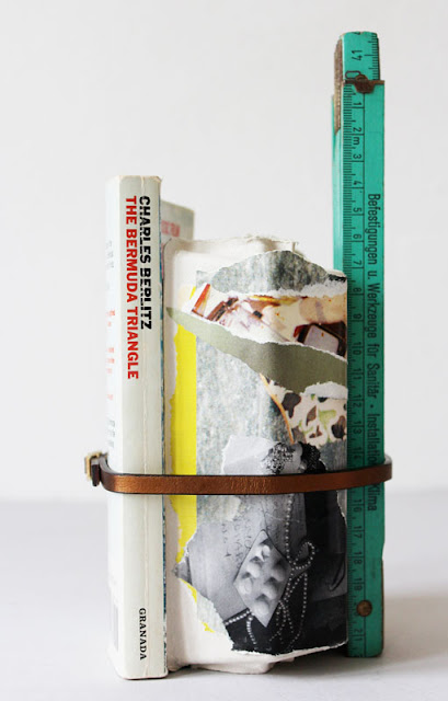 assemblage: egg box, paper, book, wooden meter, belt, 22x10x12 cm.