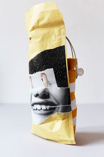 assemblage: kraft bubble envelope, paper, in-ear headphones, socks, rubber band, 27x13x12 cm.