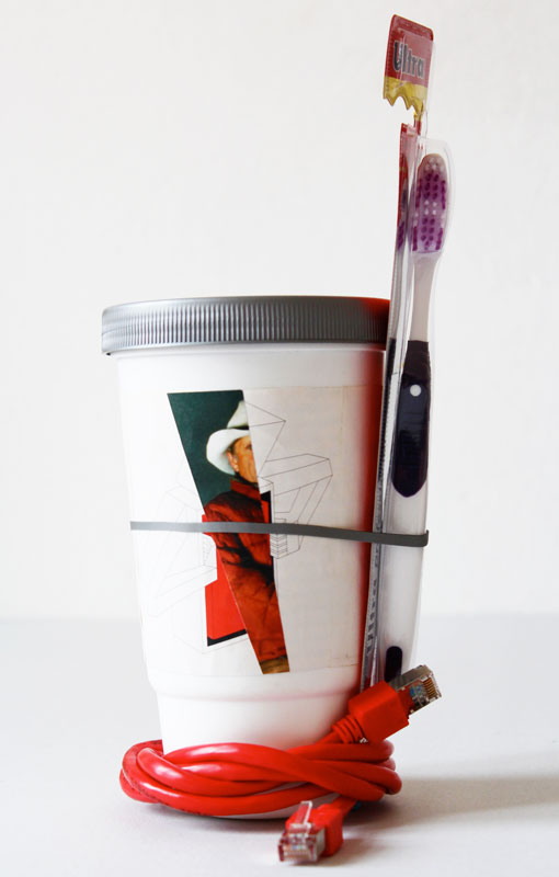 assemblage: ethernet cable, toothbrush, plastic shaker cup, paper, rubber band, 29x13x12 cm.
