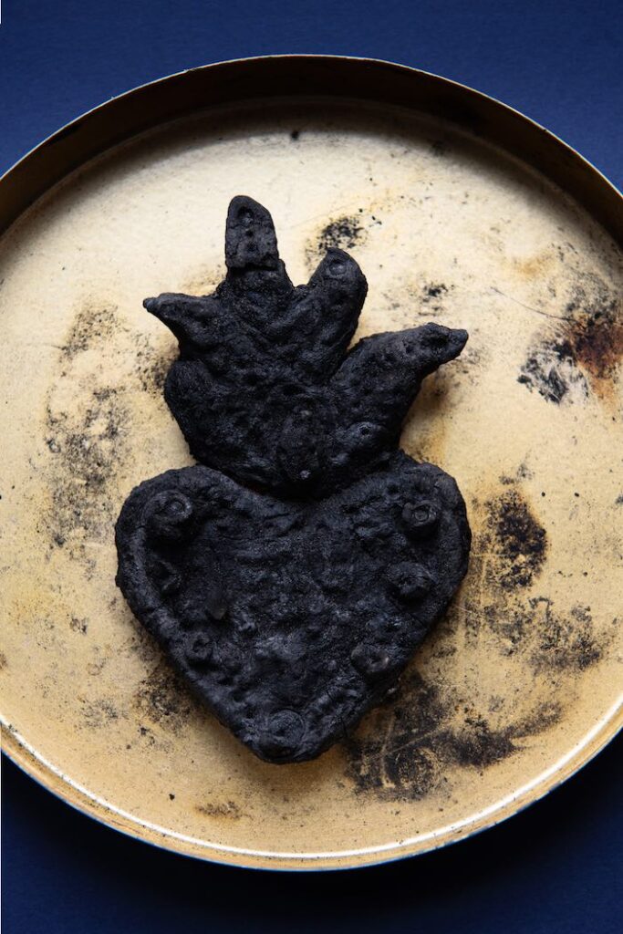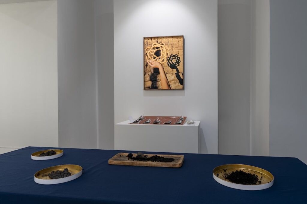 Al centro, un grande tavolo diviso in una parte chiara e in una scura: da un lato i pani come segni di memoria, dall’altro gli oggetti usati nel rito collettivo e la polvere nera che ne è derivata. Una polvere di carbone densa e generativa, capace di diventare materia per scrivere nuove parole, di tracciare desideri su stoffa, di aprire spazi di immaginazione.