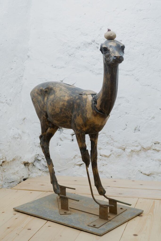 La gazzella di Michelangelo Consani, appesantita nella resa dei suoi arti inferiori, appare in qualche modo intenta a scrutare l’ambiente, lungo un tempo che parla di momentaneo stallo. Sorreggendo una patata, che con le piccole nuove radici sembra fargli da criniera, la sua presenza per tempo leggiadra si erge nelle fattezze di una sibilla (Sopra i figli dei figli del Sole, 2019).