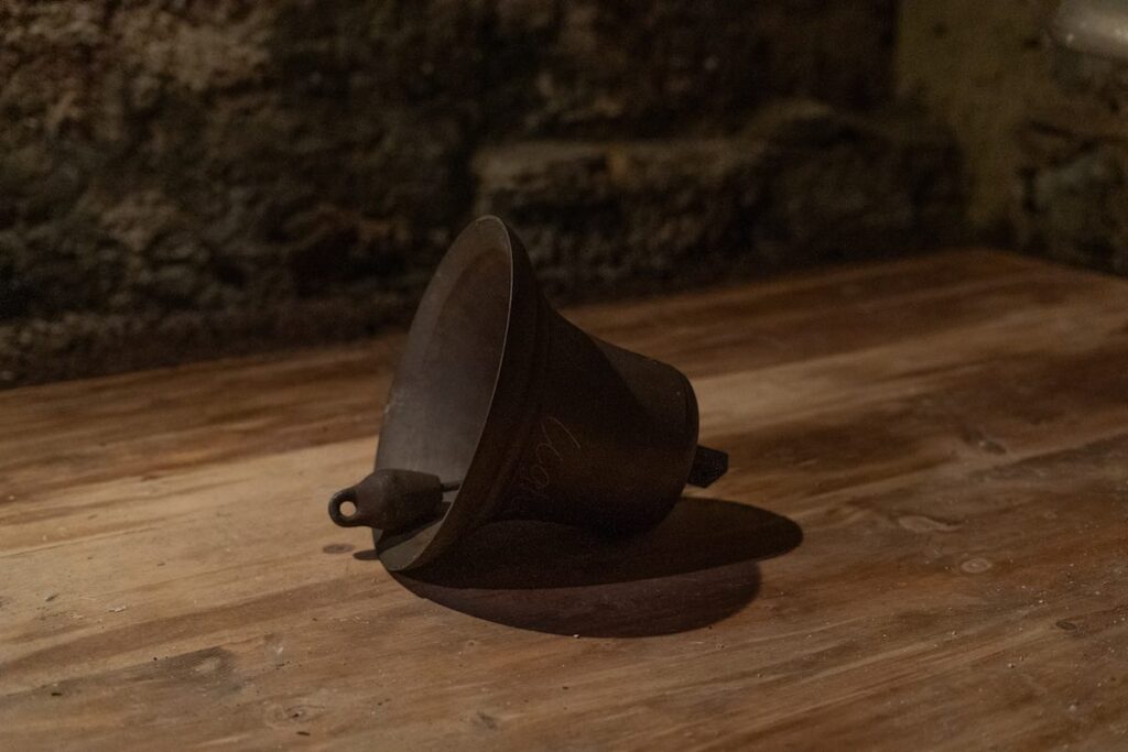 Accompagnando l’essenza intima del nido – di cui, peraltro, ha scritto Gaston Bachelard intonando la Poetica dello spazio (1975) -, ecco che le campane incise dalla mano d’artista sugellano il bagliore di una sorpresa, entro le mura possenti di uno spazio cantina.