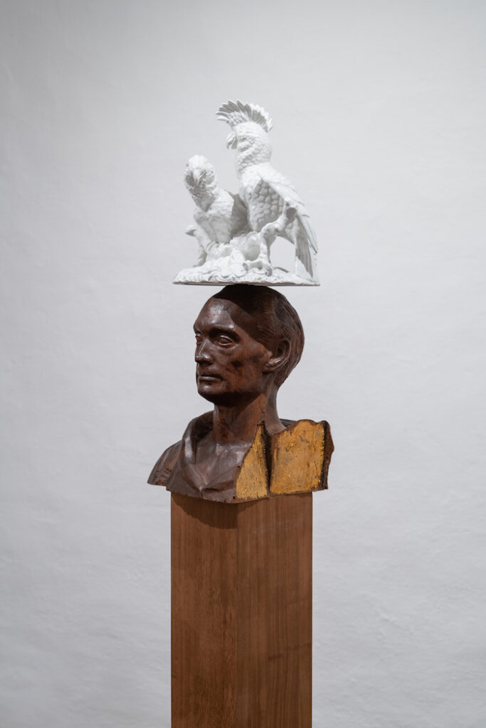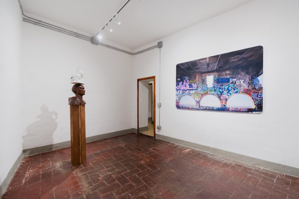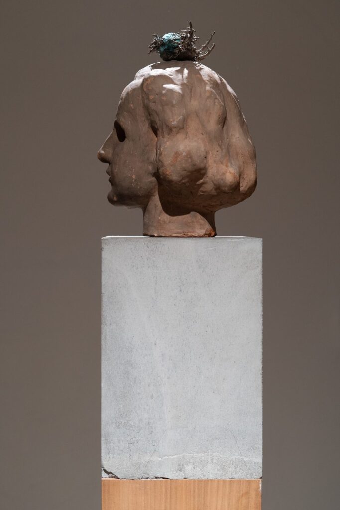 Proseguendo il viaggio oltre la stanza, ci si imbatte nel mezzobusto di un uomo (Messaggi Rivoluzionari, 2021), che offre equilibrio alla chiacchiera vivace di due pappagalli, suggellati nella ceramica. La sua presenza altera sembra allora sciogliere la figurata severità nello sguardo gettato lungo l’orizzonte a parete, sperimentato dall’Amarti mi affatica (2025)di Giovanni Ozzola.