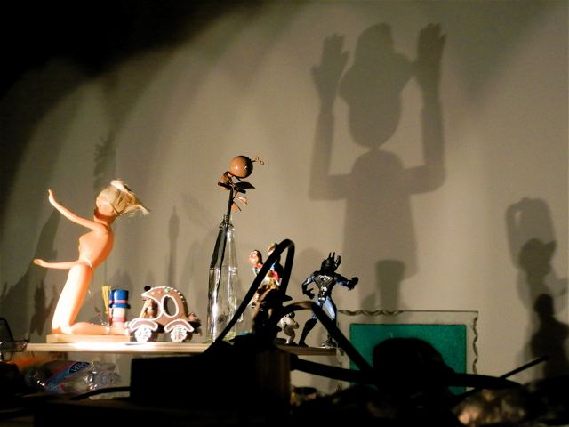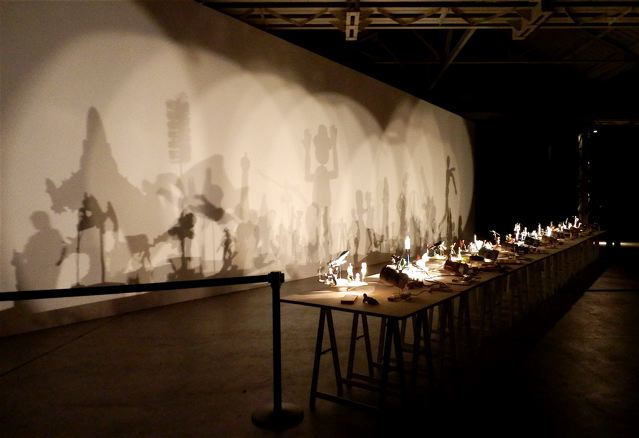 Shadow Play e? un’installazione complessa, un tavolo lungo 20 metri costellato da piedistalli girevoli su cui volteggiano oggetti e figure di varia natura, da giocattoli a piccoli elettrodomestici. Le luci a faretto illuminano le figure, proiettando le differenti ombre sulla parete bianca retrostante. Il risultato visivo e? lirico e nostalgico al tempo stesso: un teatrino delle ombre capace di narrare infinite storie.
