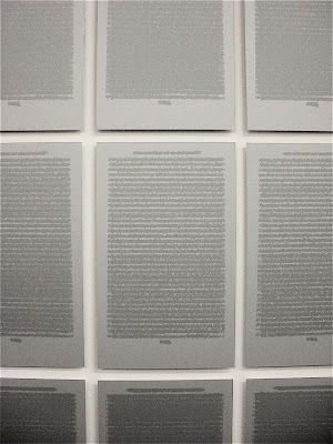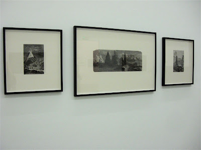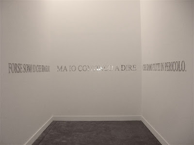 Elegante la stanza con dei lavori, quasi tutti a parete: la famosa opera della Pivi degli animali bianchi, le foto in bianco e nero di Renato Leotta, l’autoritratto tra un quadrato e un rettangolo di Francesco Gennari, le tenebrose foto di Marinella Senatore e le incisioni di vecchi paesaggi su carta di Salvatore Arancio. Nel corridoio una oramai classica installazione di Meris Angioletti che su delle piccole lastre riporta un testo di Kracauer su Edgar Allan Poe sovrapposto, dunque illeggibile.