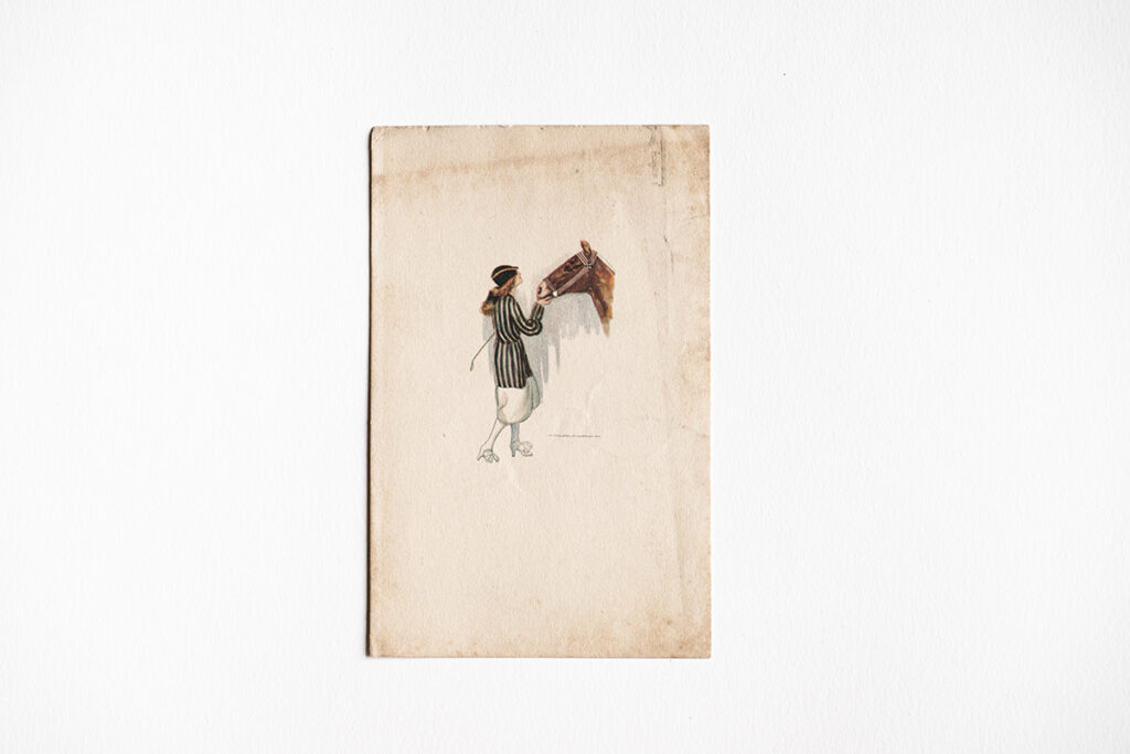 - Cartolina del 1928 di una donna con tacchi e frustino, e il suo cavallo. ↩︎
