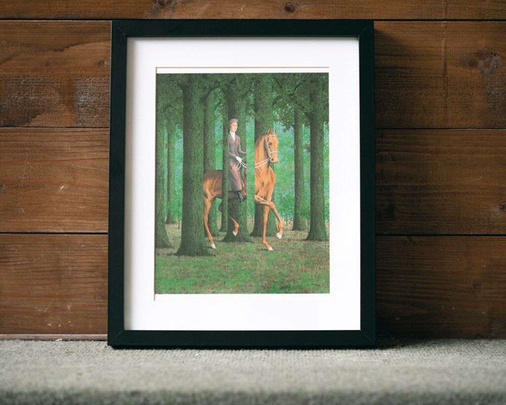 - Il dipinto è La firma in bianco di Magritte che rappresenta uno strumento di comprensione della realtà e di confusione dell’occhio. Concettualmente si lega alla relazione tra ciò che l’uomo crede di sapere e ciò che è reale nel suo “tradizionale” rapporto con il cavallo. ↩︎