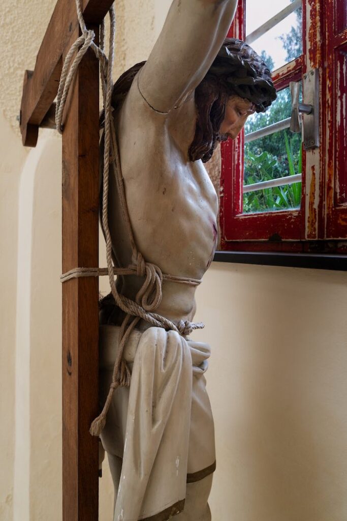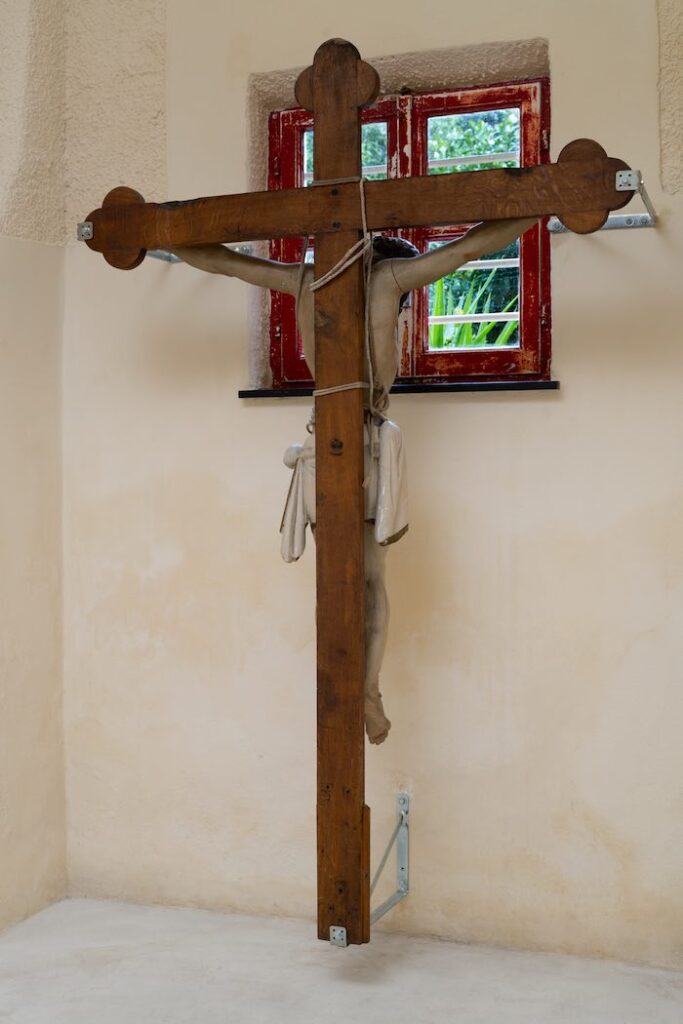 Tuttavia, se l’esercizio formale è lo stesso, la visuale delle statue cambia. La Madonna che cerca i miracoli non guarda altro che il muro. Cristo invece è davanti a una piccola finestrella, il cui telaio a sua volta forma una croce che restringe lo sguardo, ma non lo esclude del tutto. E così Cristo guarda fuori, come un carcerato da una cella, come un essere umano che vuole altro, affamato di vedere qualcosa.
