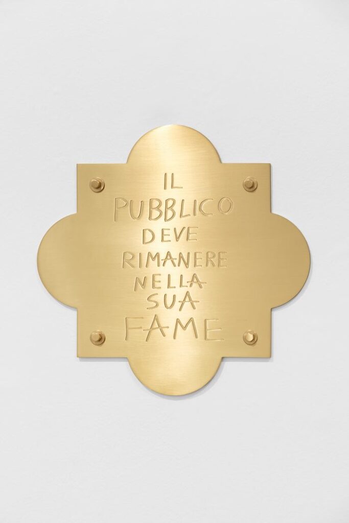 Un concetto, quello della fame, più che abusato nella cultura di massa («stay hungry, stay foolish»), che però in Incipit di Marcello Maloberti si carica di una componente spirituale totalizzante. A dispetto del titolo, Incipit è per l’artista la summa degli ultimi anni del suo lavoro. Un trittico, come le tre formelle in ottone, iniziato al PAC con la mostra Metal Panic, proseguito con La conversione di San Paolo ad Albissola (il cui legame con Incipit è ancora più forte) e terminato con il progetto in galleria Raffaella Cortese a Milano.