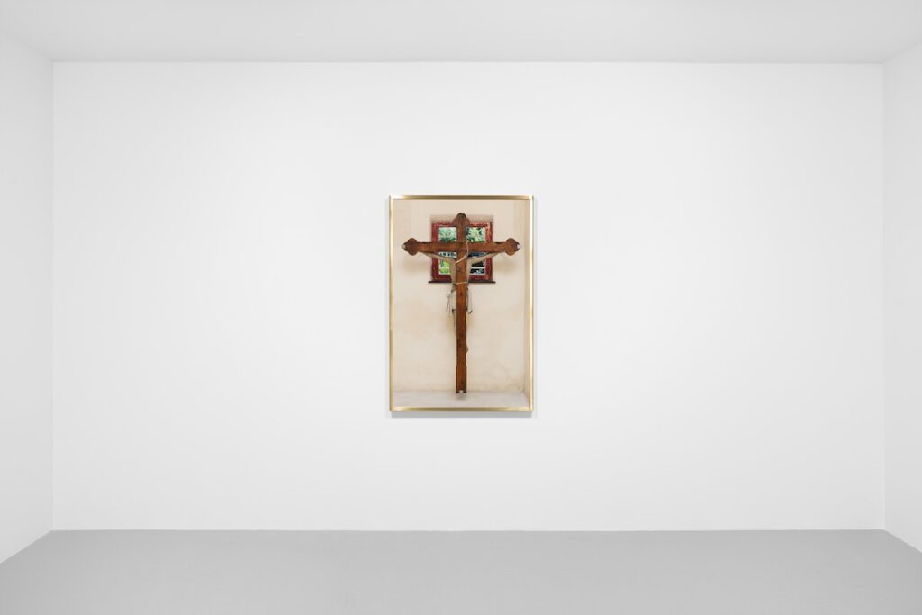 Cristo non guarda lo spettatore, ma altrove. Dal punto di vista formale, quest’operazione ricorda In search of the miracolous (2024), opera esposta per Metal Panic al PAC. Anche in questo caso, una statua della Madonna viene posizionata rivolta contro un muro. Anche il processo di ricerca dei materiali – le statue – è analogo.