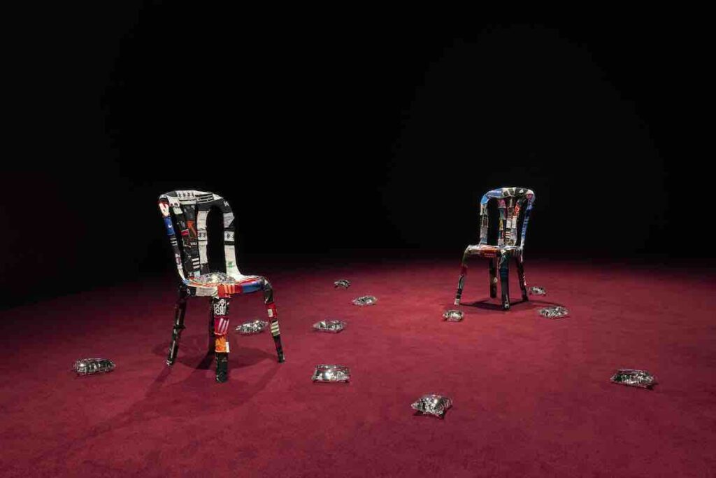 Le sculture presenti in mostra – strutture in ferro, corde annodate, frammenti di plastica, oggetti che sembrano usciti direttamente dalla palestra all’aperto – non sono semplici complementi. Sono prolungamenti materiali del film, resti che non documentano ma incarnano.