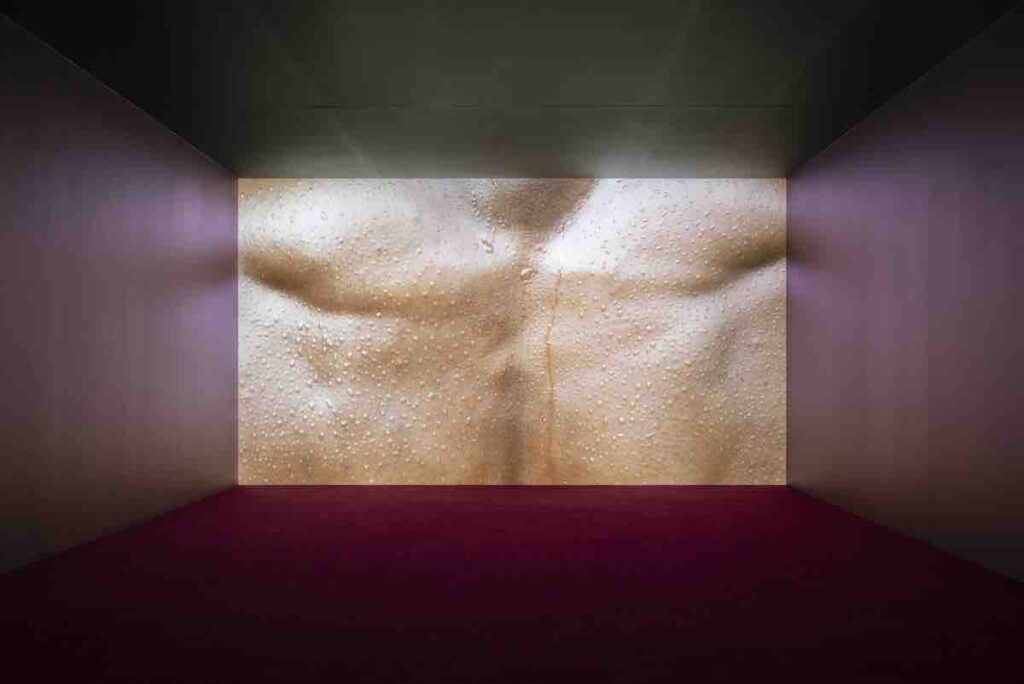 Qui la mascolinità non è mai un dato: è una performance fragile, oscillante, bisognosa di testimoni. Un’imbricazione di gesto, tono, attivazione e percezione che rende ogni movimento un esercizio di visibilità, un tentativo di essere riconosciuti senza essere ridotti a una forma unica o fissa. Nei corpi di MUSCLE la forza non è potere: è una negoziazione instabile tra resistenza ed esposizione. Achille Mbembe, riflettendo sul postcoloniale, ricorda che la vita è una negoziazione continua tra ferita e possibilità. (Politiques de l’inimitié, 2016). Nei corpi di MUSCLE questa negoziazione è visibile, palpabile, quasi dolorosa: sono corpi di bodybuilders, cesellati dalla disciplina, ma attraversati da una vulnerabilità che li spoglia della loro ostentata forza.