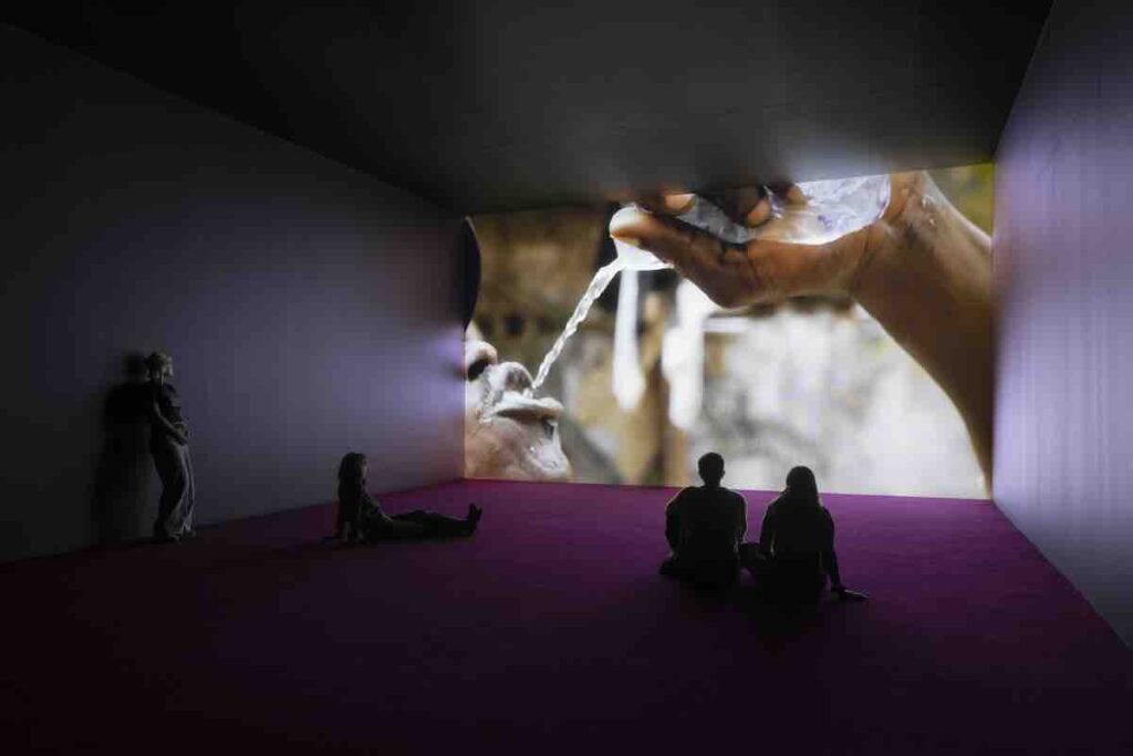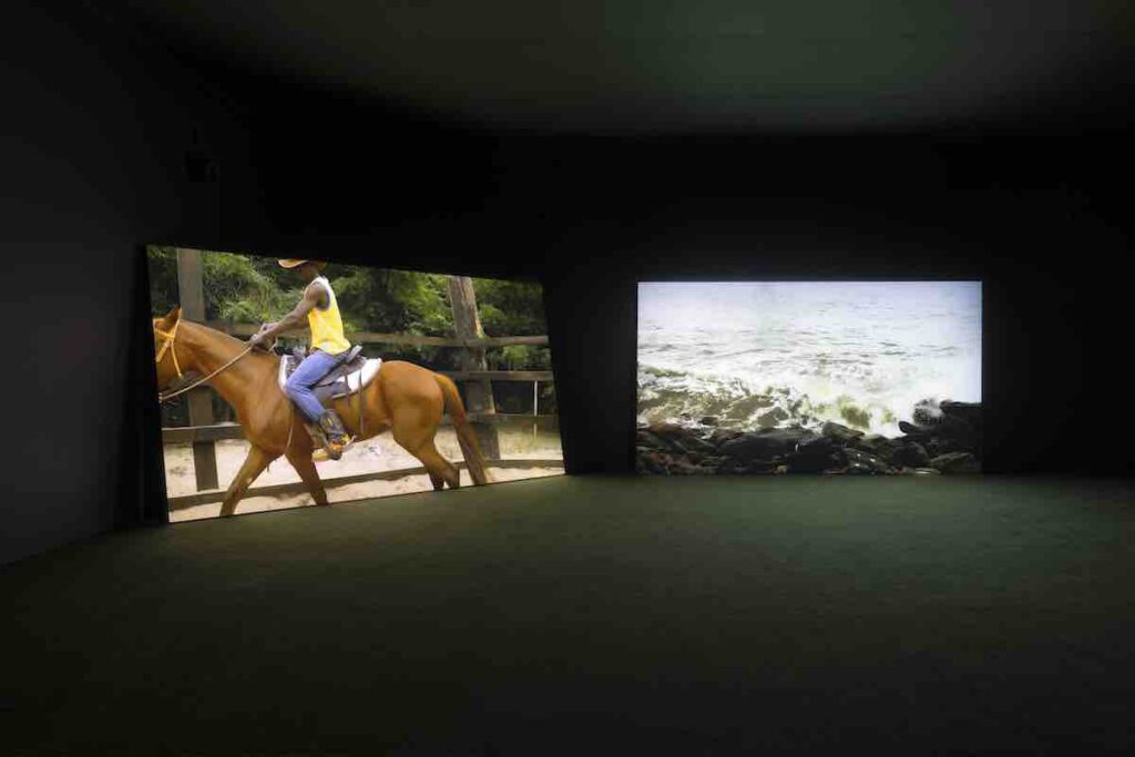 Anche se questa è una successione solo cronologica e non espositiva, dopo la ferita cromatica e tattile di King of Boys, Cowboy (2022) si offre come un intervallo di grazia. Non un sollievo, ma una sospensione. Un uomo cammina accanto al suo cavallo su una distesa d’acqua e sabbia: non c’è eroismo, non c’è posa, solo un passo condiviso, una forma di complicità elementare. In un luogo dove il mare porta con sé la memoria della storia africana – partenze forzate, ritorni impossibili, orizzonti che feriscono – Ashadu non cerca il trauma: cerca il fiato. Il cavallo non è un simbolo ma un corpo che accompagna un altro corpo, un modo di attraversare il mondo. Il film suggerisce che la mascolinità può essere, almeno per un momento, un gesto di cura, un equilibrio provvisorio con la terra e con l’animale. È un respiro lento tra due densità, una parentesi di fiducia che non cancella la fatica ma la riconfigura.
