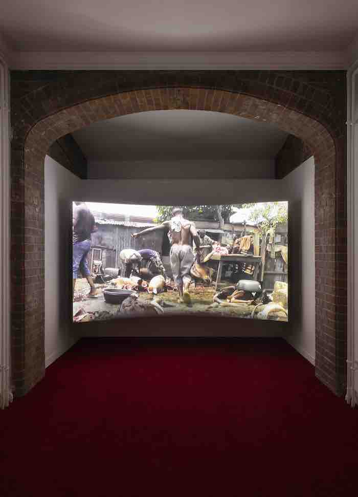 In King of Boys (Abattoir of Makoko) (2015), il film che apre cronologicamente questo percorso, una bottiglia di plastica rossa riciclata — una membrana povera, improvvisata — tinge il mattatoio di Makoko di una febbre cromatica, trasformando la visione in una condizione percettiva. Per un istante, il mondo appare filtrato dall’interno del corpo, come se la camera stessa respirasse sangue e calore. Non è un documentario: è un corpo che guarda altri corpi. La cinepresa si muove come un organo interno, un battito che si confonde con quello degli uomini.