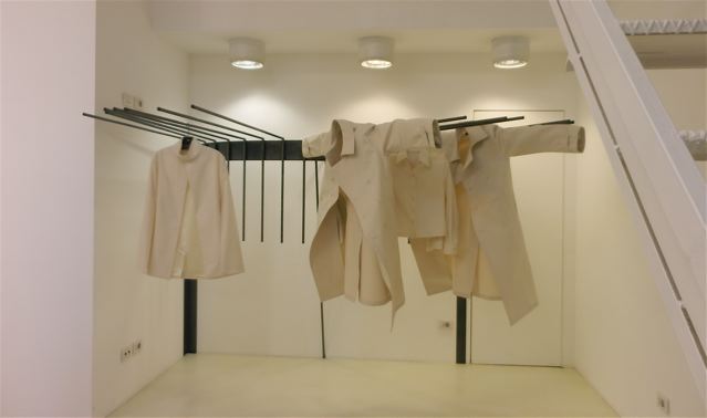 Passeggiata al sole per raggiungere lo spazio di Kaleidoscope che ospita ADELE RO?DER with Lydia Rodrigues COMCORRO?DER. Adele promuove in Via Masera un vero e proprio temporary shop con capi di abbigliamento personalizzabili attraverso la scelta di tessuti e stoffe da lei ideati, sull’ esempio di Sonia Delaunay (andate a vedere la bellissima mostra di questa artista geniale alla Fondazione Marconi, fino al  31 marzo). La Ro?der si prefigge di “superare la rigidità del tesuto, la sua natura inanimata, regolare astratta e spiegare le sue forme su un corpo femminile – anzi no – sulla superfice del mondo.” Non mi preoccupo se ci riesce. Ho ricordi di storia del costume e, questa fida è da secolo che molti stilisti si preoccupano di affrontare e non solo con gli abiti, ma anche in seno ad un concetto di abito molto elevato. Osservo, invece, le curiose ‘fantasia’ delle sete svolazzante dal soffitto al pavimento. Macchinosa l’installazione degli abiti irrigiditi.