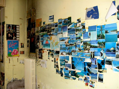 Lo Spazio Marris è talmente ‘caratterizzato’, ha un’atmosfera così decadente-chic (evito la ‘vecia Milan’ come riporta il CS), che è quasi inevitabile non scindere il contenuto dal contenitore. La carta da parati scrostata, la stanzetta con decide di cartoline da vacanze assolate, la luce fioca… insomma tutto si ammanta di incanto e bla bla.