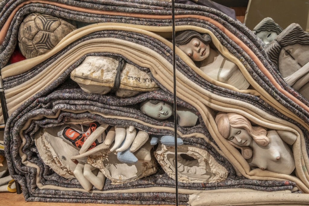 Il gesto più radicale avviene però nell’Exhibition Room, trasformata in storeroom. Qui la mostra abbandona qualsiasi idea di esposizione ordinata per assumere la forma di un deposito stratificato, un retrocasa che coincide con una scena psichica. Strata e Inventory (2025) non promettono classificazione né chiarezza: mostrano l’inventario come pratica provvisoria, sempre incompleta, e lo stoccaggio come condizione necessaria della visibilità. Il pubblico entra nello spazio che normalmente resta nascosto, quello in cui le cose vengono tenute insieme prima di essere esposte o dopo essere state rimosse. Museo e casa si scambiano di posto, e la distinzione tra ciò che è mostrabile e ciò che sostiene il mostrabile si dissolve.