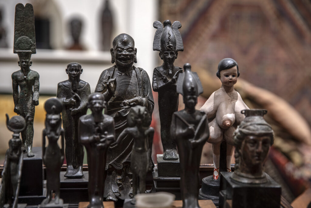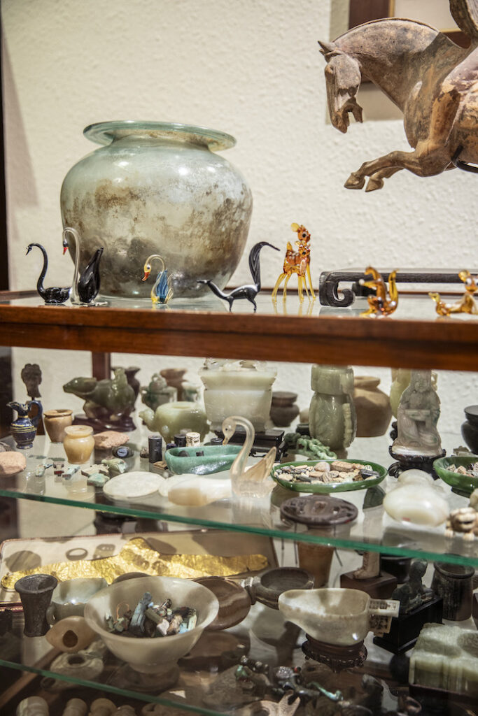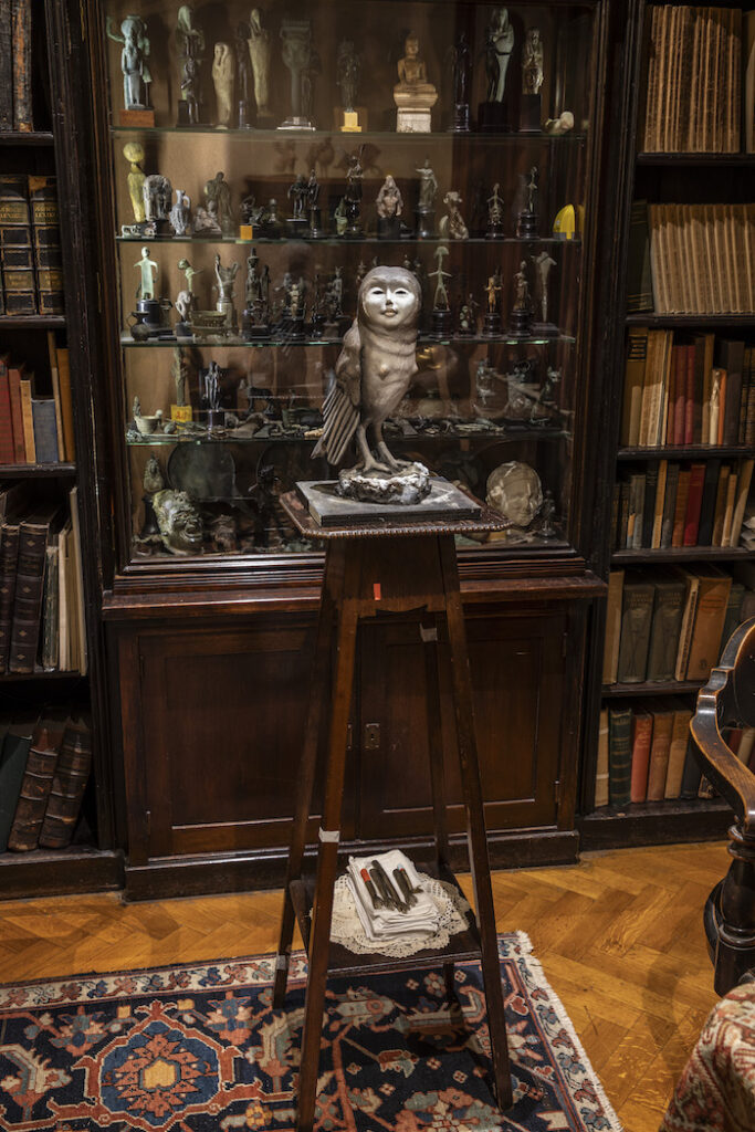 Sulla scrivania, più di duemila figure di divinità egizie e greche vegliano come presenze della mente — non reliquie, ma interlocutrici silenziose di un dialogo incessante tra materia e sogno. Il divano, coperto da tappeti orientali, non è un arredo ma un altare della parola. La luce vi scivola accanto come una sostanza psichica, attraversa i vetri spessi, indugia sulle stoffe, sulle cornici, sui libri aperti. Ogni oggetto sembra contenere un residuo di voce, un battito remoto. È una casa costruita per accogliere la parola: un organismo che continua, anche ora, a sognare. L’aria stessa vi ha imparato la pazienza del silenzio e il tempo vi scorre con la lentezza di chi ha cessato di difendersi.