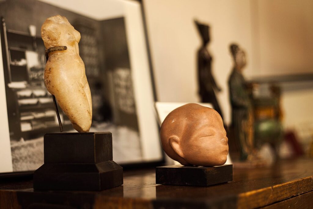 In the study, works such as Resistant Materials / Unstable Objects (Study) (2025) coexist with earlier works by the artist and with Freud’s objects in a fragile equilibrium of surfaces and consistencies. Plaster, wood, glass, fur: materials that do not compete for visibility, but make perceptible the labour of maintenance that holds things together. There is no mimicry, no quotation, but a controlled friction that renders the space slightly unstable, as though order were always open to renegotiation.