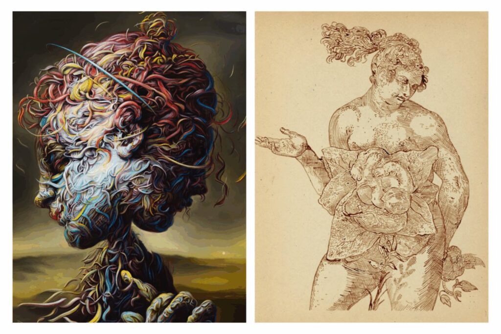 Nel lavoro di Glenn Brown, questa distanza prende corpo. Le immagini della storia dell’arte non vengono citate, ma attraversate: piegate, invertite, fuse, come se il tempo le avesse rese molli. I corpi che emergono sono instabili, stratificati, spesso irriconoscibili; sembrano voltarsi dall’interno verso l’esterno, come se la pelle non bastasse più a contenerli. Leader parla di aftercare: non guarigione, ma attenzione. Non una riparazione del passato, bensì una sua trasformazione lenta. Nella casa di Freud, queste opere non spiegano nulla. Non illustrano la psicoanalisi, non la celebrano. Agiscono come sogni che non chiedono di essere interpretati subito. Il divano, lo studio, gli oggetti archeologici partecipano a una scena analitica dilatata, in cui le immagini funzionano come residui di pensiero che tornano senza annuncio. Nulla viene ordinato, nulla viene risolto.