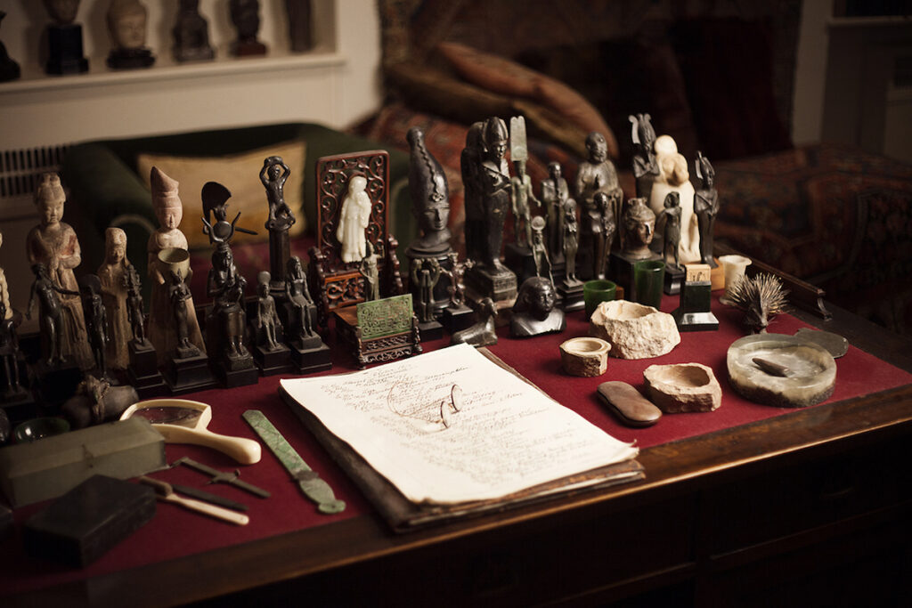 On the desk, more than two thousand figures of Egyptian and Greek deities keep watch as presences of the mind — not relics, but silent interlocutors in an unbroken dialogue between matter and dream. The couch, covered in Oriental rugs, is not a piece of furniture but an altar of speech. Light slips alongside it like a psychic substance, passing through thick panes of glass, lingering on fabrics, frames, open books. Each object seems to contain a residue of voice, a distant pulse. This is a house built to receive words: an organism that continues, even now, to dream. The air itself has learned the patience of silence here, and time moves through the rooms with the slowness of someone who has stopped defending themselves.